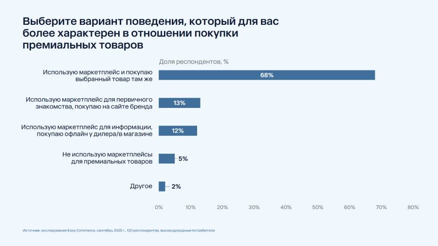 Доля опрошенных потребителей с высоким доходом, приобретающих премиальные товары на маркетплейсах, составила 68%. Об этом говорится в исследовании Easy Commerce.