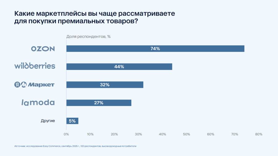 Среди платформ, интересующих покупателей премиальных товаров, лидирует Ozon. Его указали 74% участников опроса. Затем следуют Wildberries, «Яндекс Маркет» и Lamoda.