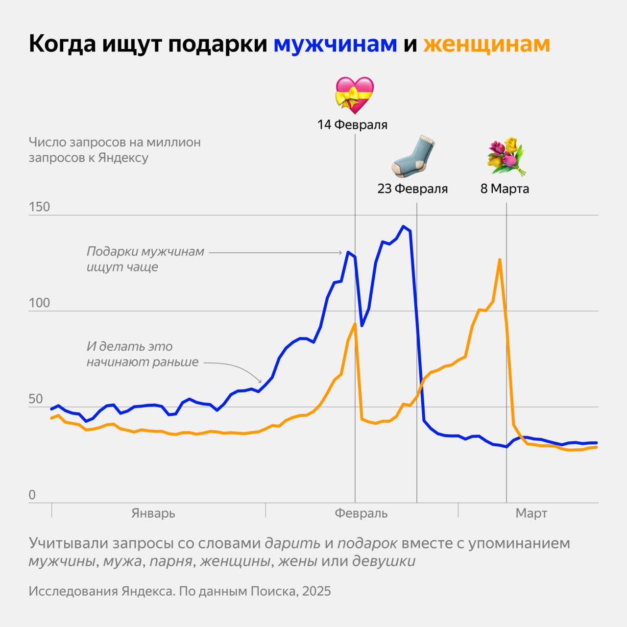 Различаются не только сроки, но и бюджеты. Мужчины закладывают на подарки 5–10 тыс. руб., тогда как женщины чаще ориентируются на 3–5 тыс. В поисковых формулировках также прослеживаются гендерные особенности: для парней чаще ищут недорогие, бюджетные и запоминающиеся варианты, а в запросах о подарках для девушек преобладают определения «необычный», «дорогой» и «интересный». Женам выбирают романтичные, приятные и даже сексуальные варианты, мужьям — оригинальные, необычные и съедобные.