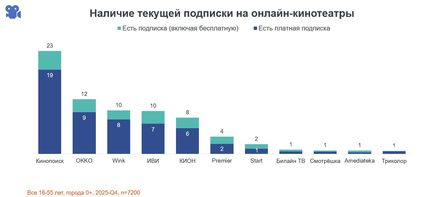 Лидером среди платформ стал «Кинопоиск» ― его использовали 23% участников опроса, в том числе 19% платили за подписку. За ним с заметным разрывом следуют Okko, Wink, «Иви» и «Кион». Рейтинг не изменился со второго квартала 2025 г., уточнили аналитики.