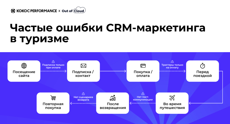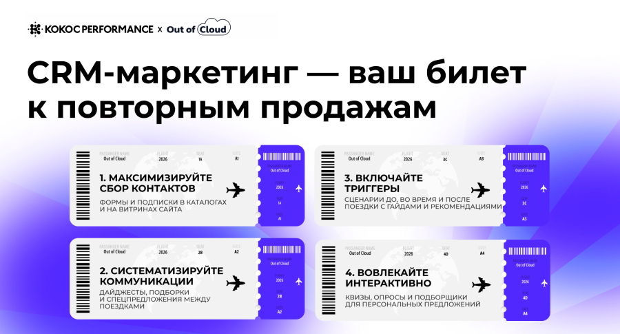В туризме сильные продукты и высокий трафик, но после покупки связь с клиентом часто обрывается. Новое исследование Out of Cloud (Kokoc Performance, входит в Kokoc Group) показывает, что российские компании в туристической отрасли используют CRM-маркетинг недостаточно системно. Между посещением сайта и следующей поездкой теряется значительная часть потенциальной выручки, хотя несколько простых инструментов могут укрепить лояльность и вернуть клиентов без лишних затрат