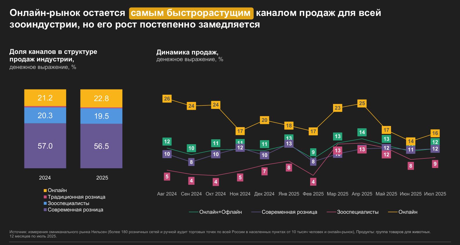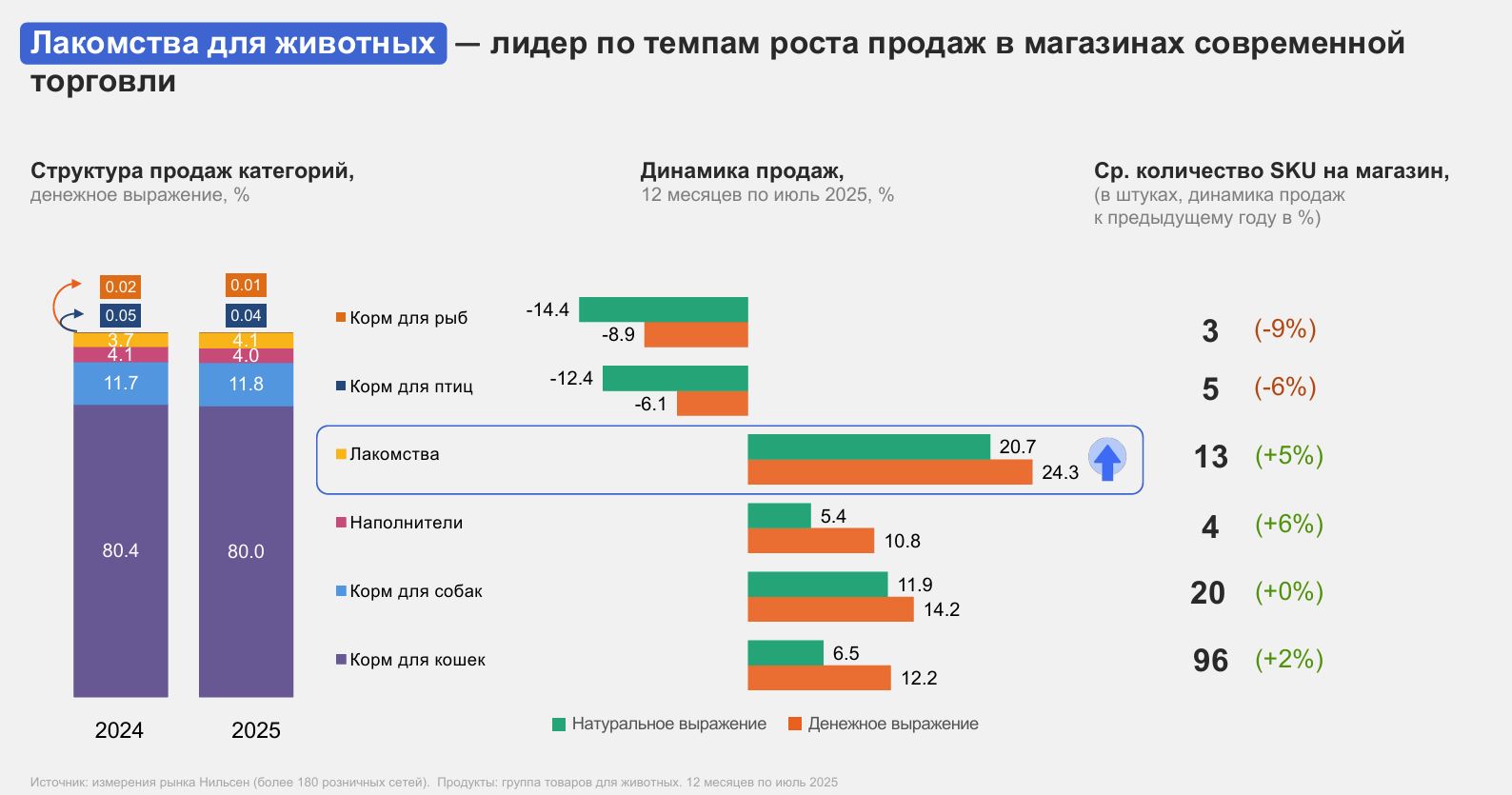 В структуре омниканального FMCG-рынка товары для животных занимают 5%. Индустрия демонстрирует положительную динамику: за период с июля 2024 по июль 2025 г. продажи в денежном выражении выросли на 15%. В упаковках рынок вырос на 6,7%.