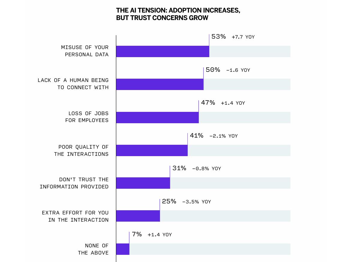 Сегодня 73% респондентов используют ИИ для повседневных задач, и половина считает, что он окажет положительное влияние на общество. Однако в области клиентского сервиса ИИ показывает негативные результаты. Каждый пятый потребитель заявил, что нейросети и чат-боты в службе поддержки не принесли им никакой пользы, что стало худшим показателем среди всех задач для ИИ.