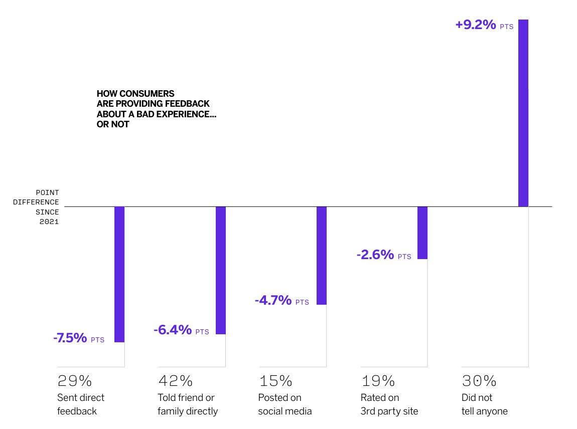 Второй ключевой тренд — рост усталости от опросов, что лишает бизнес обратной связи. Почти треть (30%) потребителей после негативного опыта взаимодействия с брендом не сообщают о нем, что стало рекордным показателем с 2021 г. При этом в половине случаев покупатели сокращают свои расходы на продукты компании.