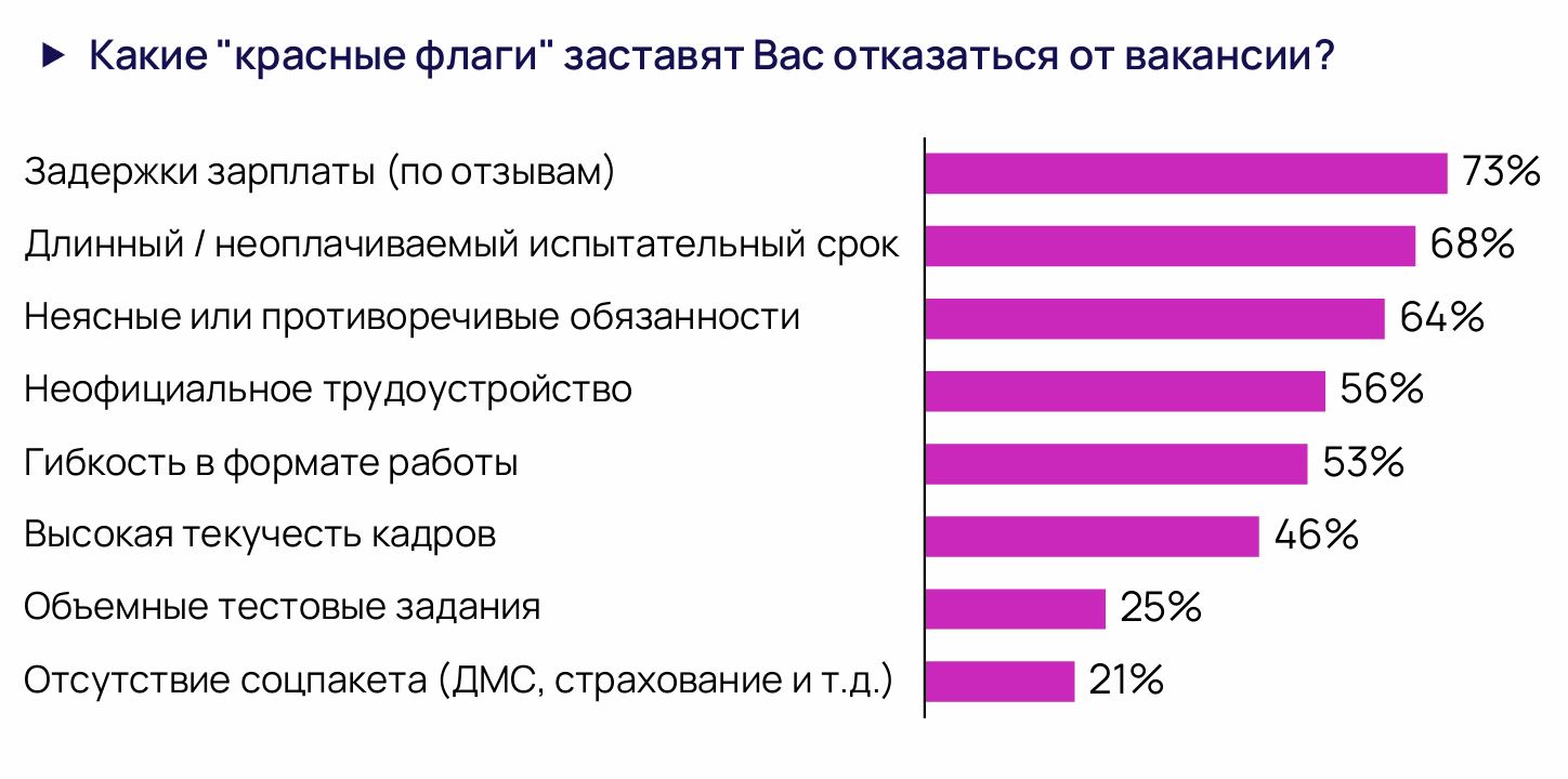 Для самих сотрудников ключевым критерием выбора работодателя остается заработная плата — 73% готовы сменить работу «уже завтра» при предложении роста дохода от 20%. При этом 61% респондентов согласны на среднюю зарплату при условии баланса между работой и личной жизнью.
