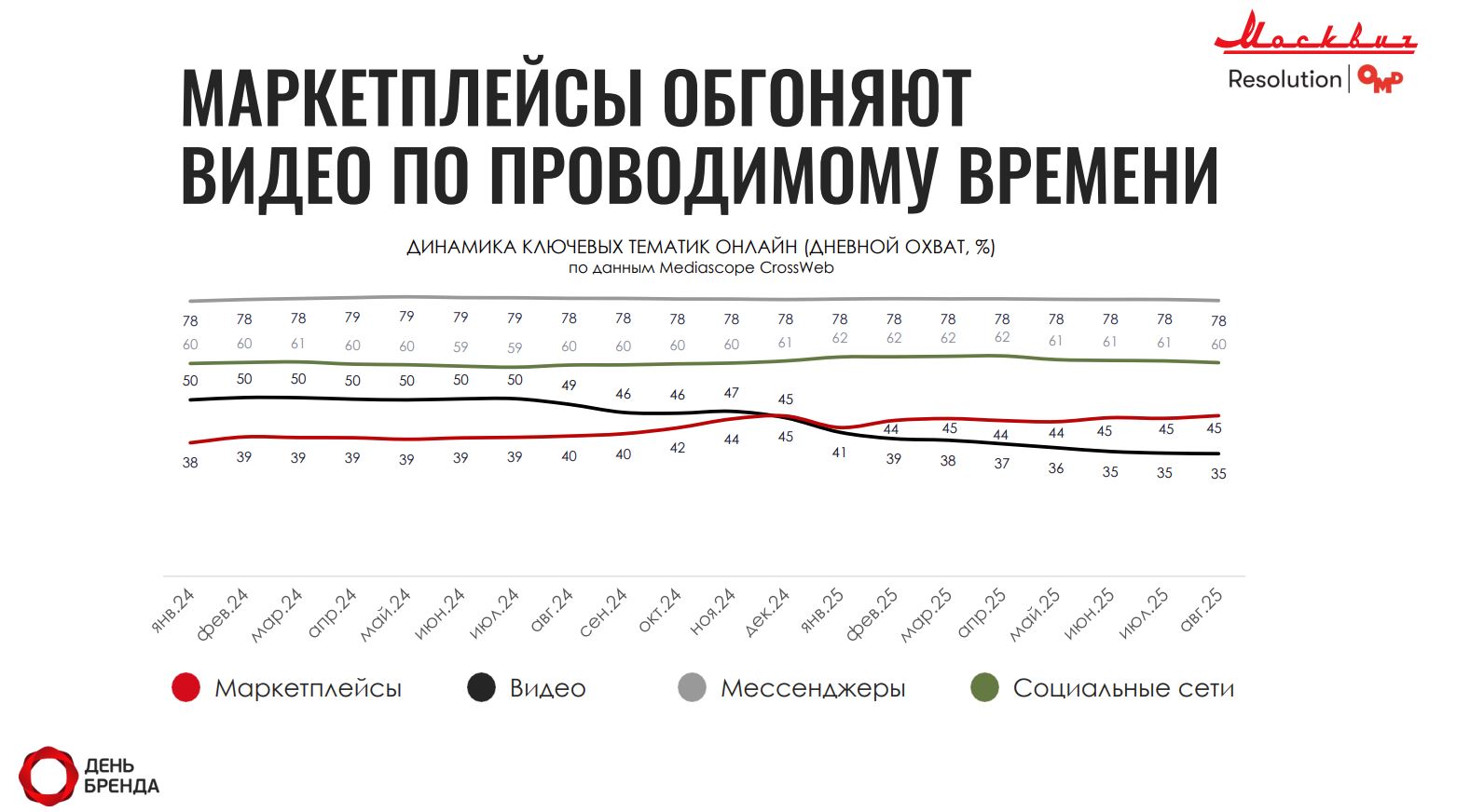 Первый тренд — смещение фокуса с охвата к действию через клик-аут на маркетплейсах. Это обусловлено тем, что маркетплейсы по проводимому времени уже обогнали такие категории, как видео. Реклама здесь интегрирована в путь клиента, а потому CTR в 2–3 раза выше. Экономический контекст подтверждает тенденцию: ожидается, что к 2030 г. доля продаж в РФ через e-com достигнет 40%.