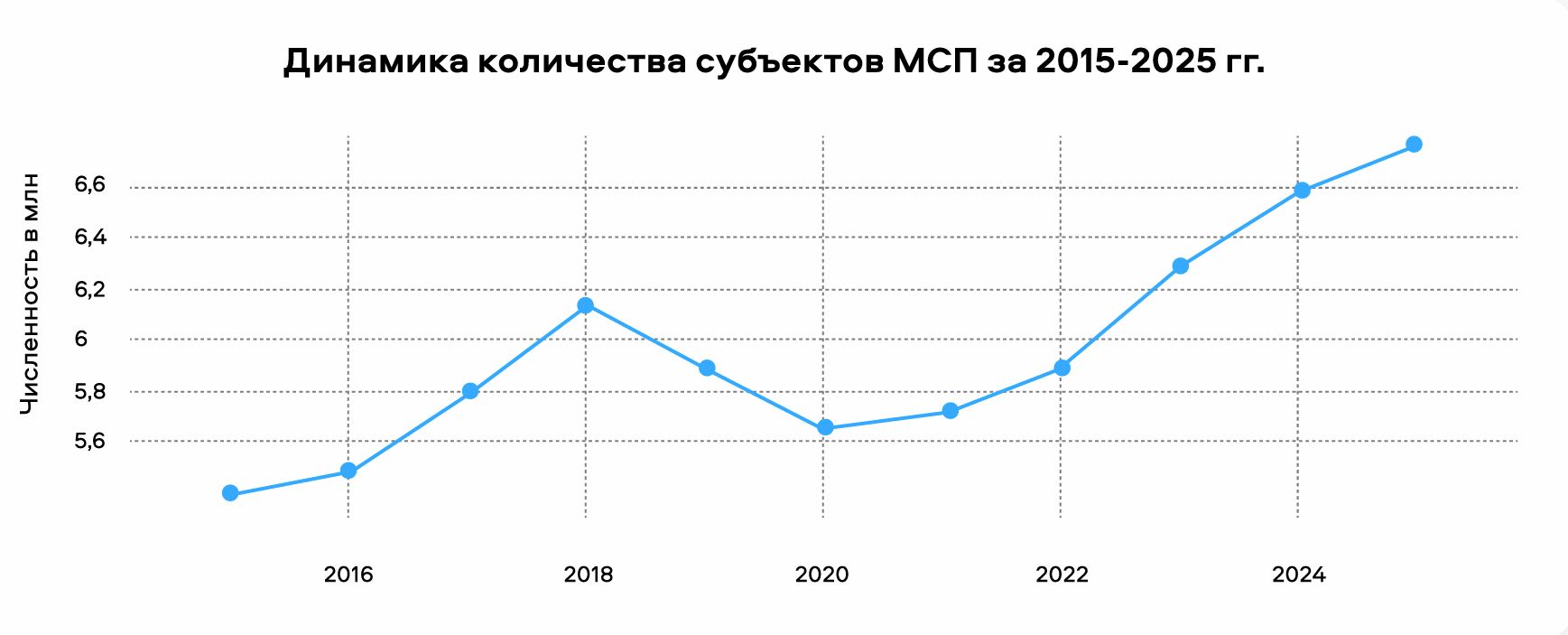 Сектор малого и среднего предпринимательства (МСП) в России продолжает последовательно развиваться. По данным на август 2025 г., зарегистрировано 6,5 млн субъектов МСП, что на 17,2% больше, чем 10 лет назад. Доля МСП в экономике составляет 21,7%, а общая численность занятых в этом секторе, включая предпринимателей и сотрудников, достигает 27,9 млн человек.
