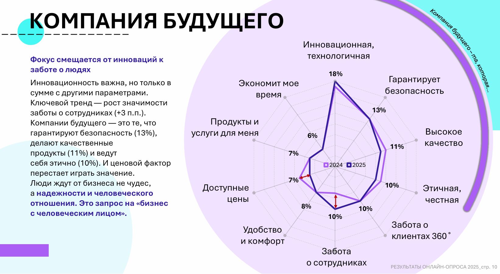 В случае бизнеса фокус смещается от инноваций к заботе о людях. Ключевой тренд — рост значимости заботы о сотрудниках (+3% год к году). Компания будущего — это в первую очередь организация, которая гарантирует безопасность (13%), производит качественные продукты (11%) и ведет себя этично (10%). Ближе всех к этому подобрались отрасли IT и телекома, а также науки и фармацевтики. Рынки ретейла и недвижимости находятся дальше всего от будущего.