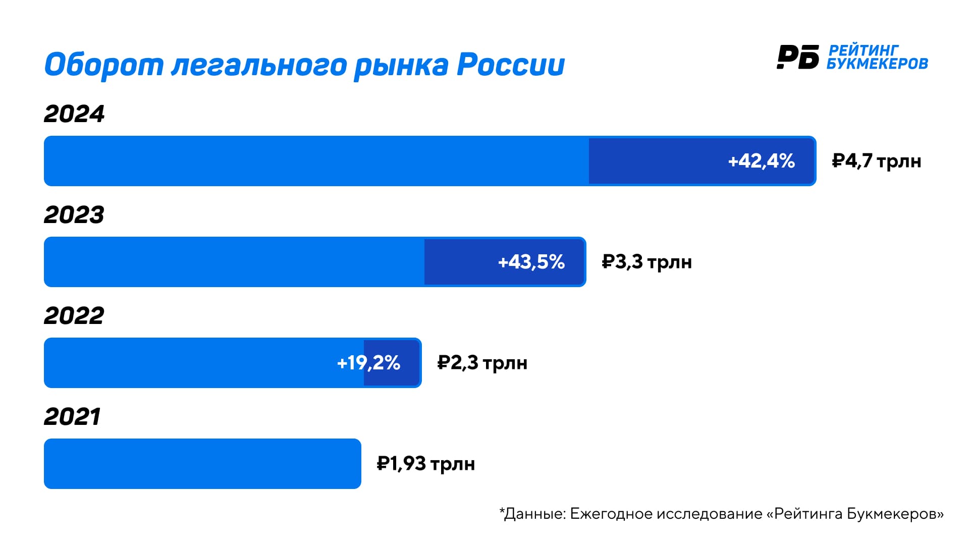Дошло до того, что оборот легального рынка беттинга в России в 2024 году составил 4,7 трлн руб. Для понимания: это почти 13% федерального бюджета в том же, 2024 году.
