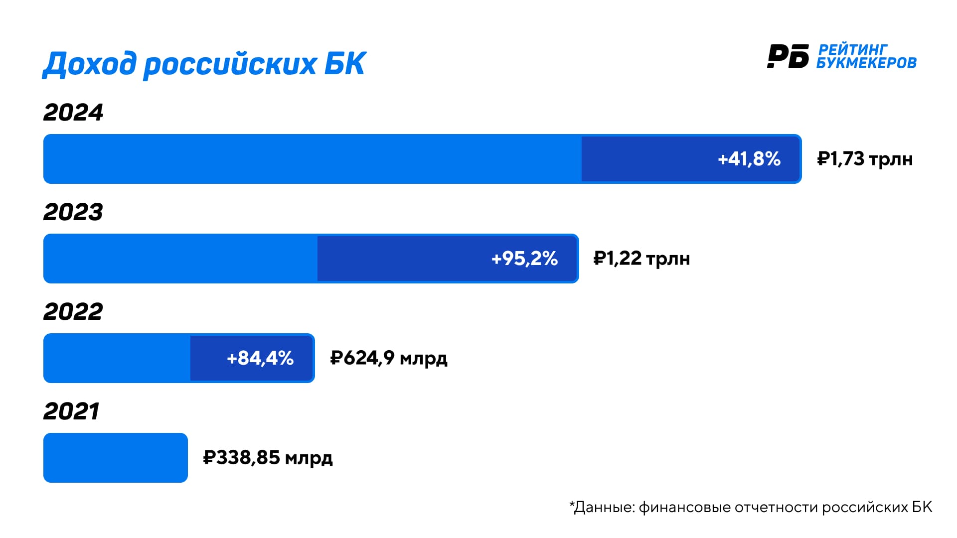 Еще более высокий рост можно увидеть в финансовых отчетностях самих букмекеров. В период с 2021 по 2023-й совокупная выручка легальных букмекеров практически удваивалась каждый год.