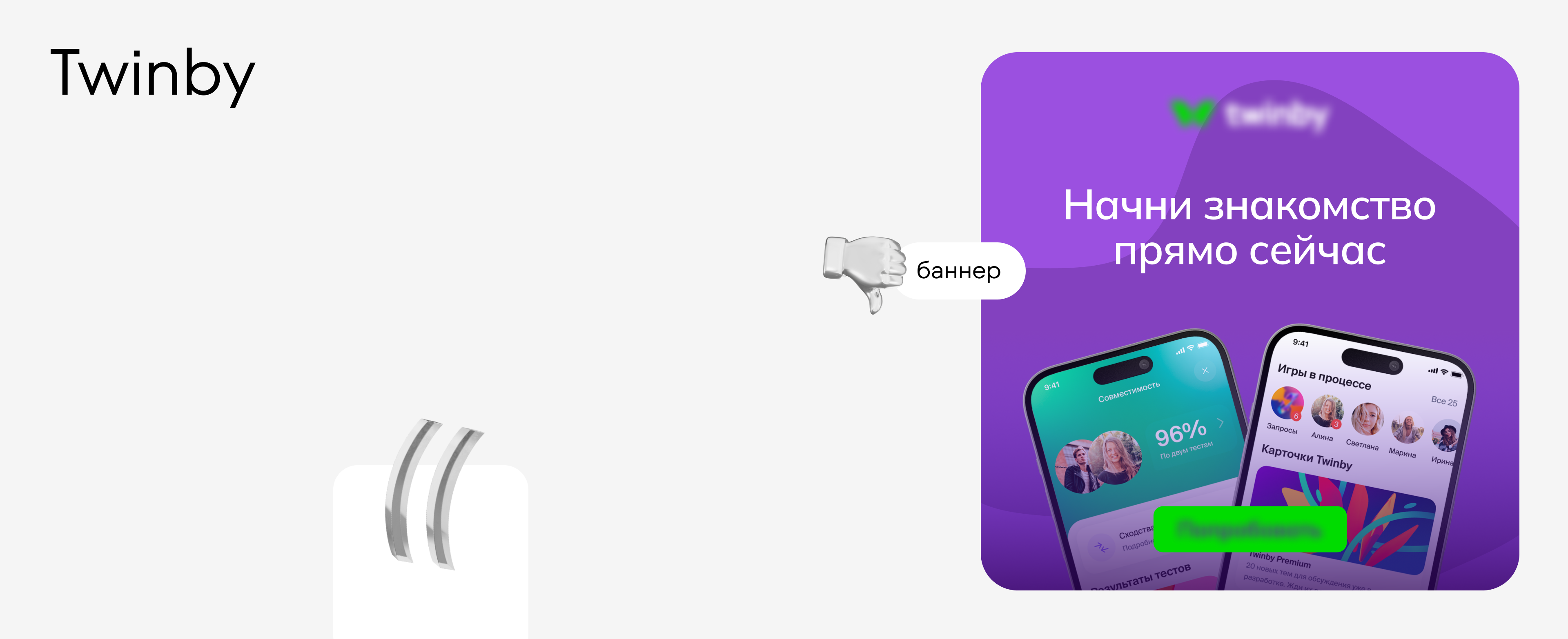 Дейтинг-сервис Twinby. В ДНК бренда фокус на осознанные отношения и поиск партнера со схожими интересами. Для этого в приложении есть функционал с тестами на совместимость. В рекламной кампании клиенту было важно, чтобы пользователи не просто скачивали приложения, а оформляли платные подписки.