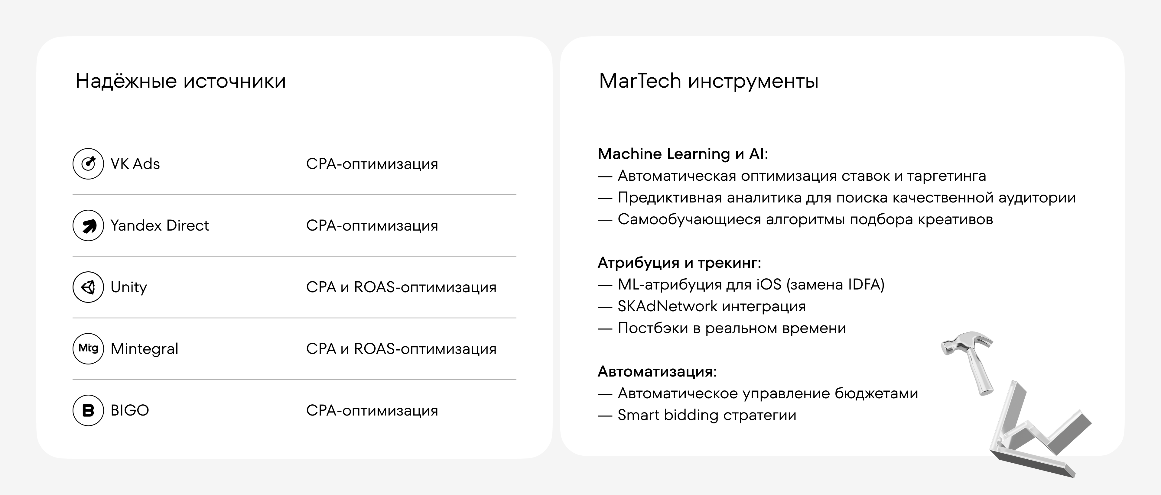 VK Ads, «Яндекс», Unity, Mintegral, in-app сеть Bigo — все эти площадки предлагают качественный трафик и позволяют лучше масштабировать кампании за счет эффективных алгоритмов закупки и ранжирования креативов.