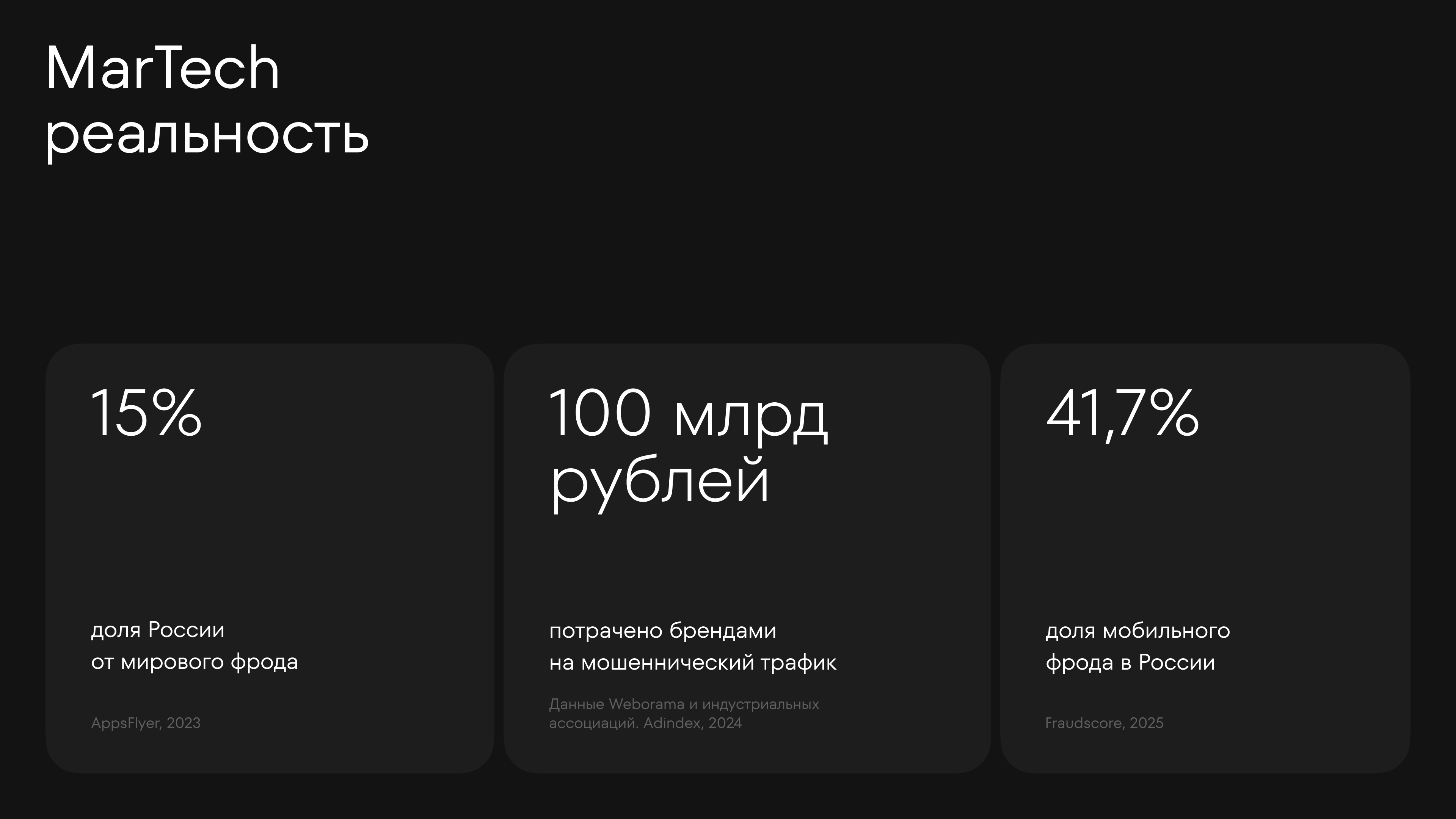 • Россия уже занимает 5-е место в мире по объему рекламного фрода: 15% от мирового объема, по данным AppsFlyer за 2023 год.
