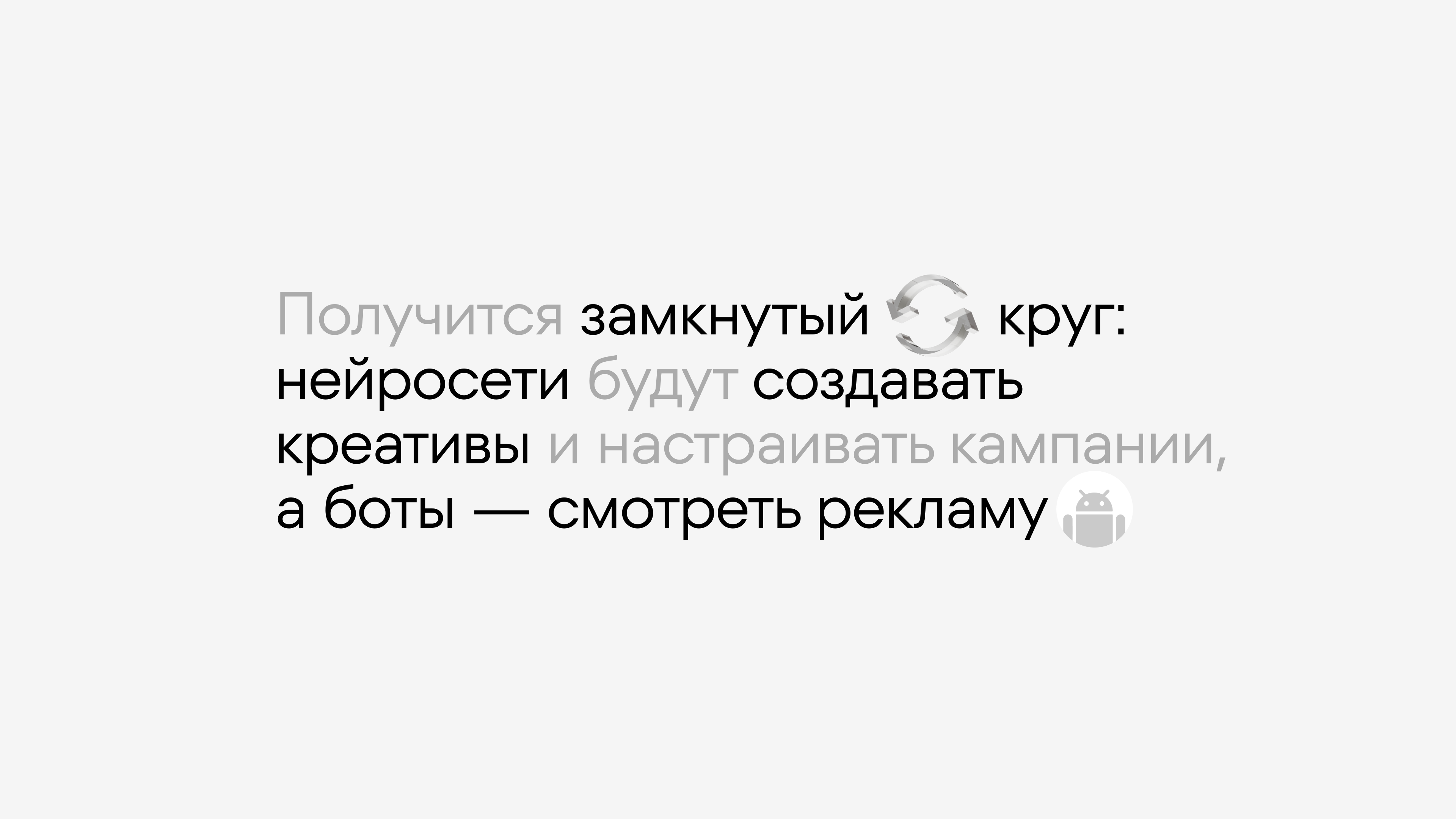 Если рынок и дальше будет идти по этому пути, скоро мы окажемся в точке, где в маркетинге не останется работы человека. Вся реклама будет состоять из сгенерированных баннеров с логотипами брендов и кнопкой установки. Всю остальную работу будут выполнять алгоритмы DSP-платформ — подмешивая фродовый трафик под видом реальных пользователей.