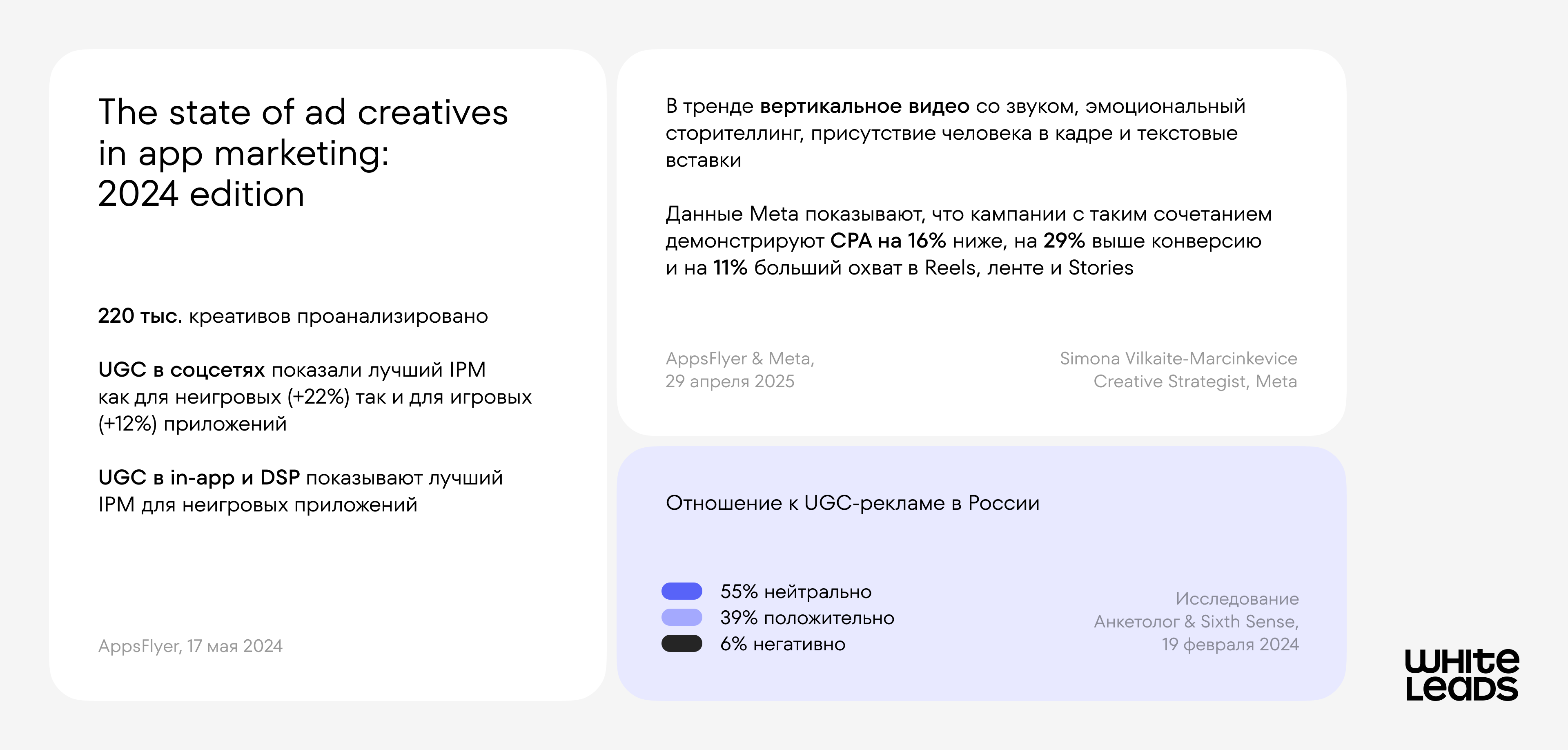 Сегодня самый эффективный инструмент мобильной перформанс-коммуникации — UGC-креативы, нативные вертикальные ролики, ставшие основой мирового потребления контента. AppsFlyer уже два года подряд говорит об этом в своих отчетах.