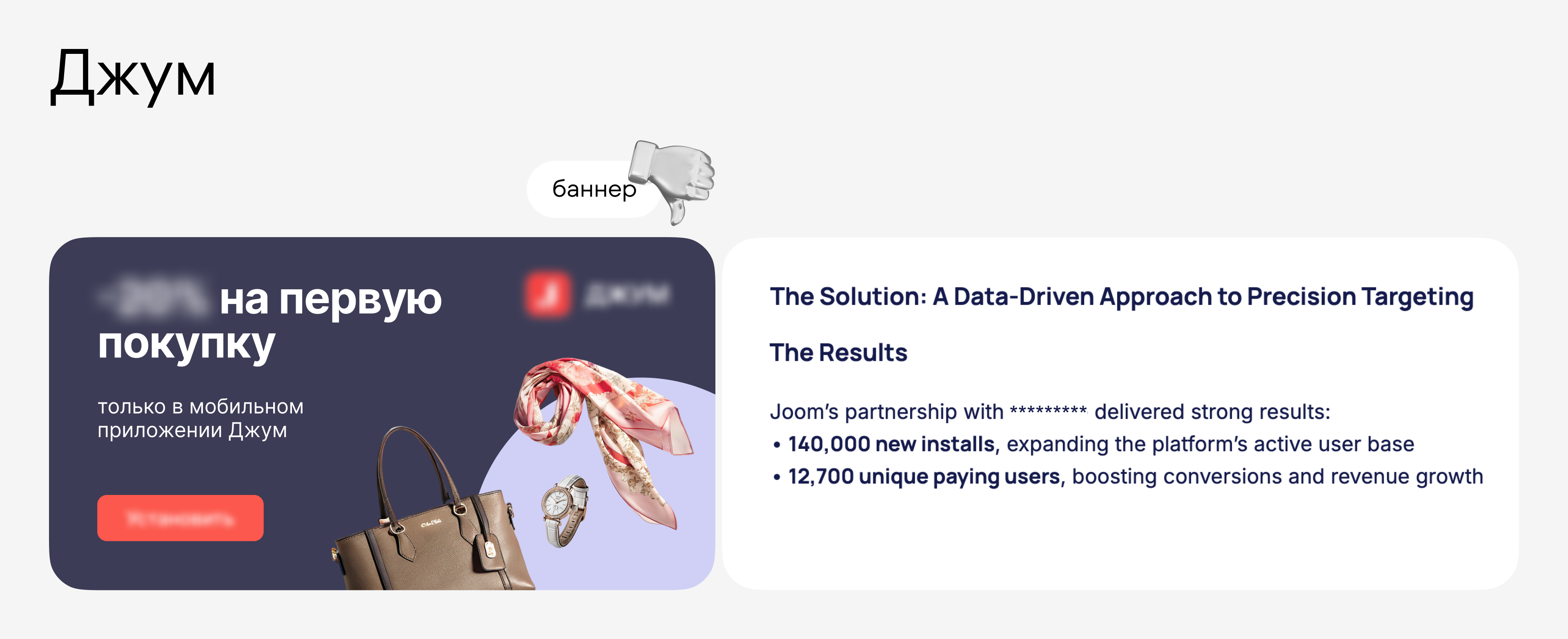 «Джум». Команда маркетплейса сотрудничала с вышеупомянутой DSP-платформой. В рекламной кампании они делали упор на креативы в формате баннеров и data-driven-подход. Результат: 140 тыс. новых пользователей и 13 тыс. покупателей.