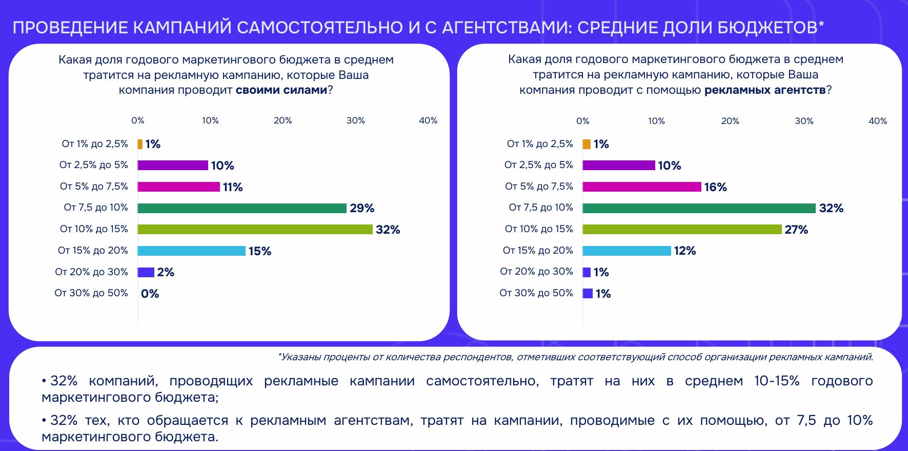 Согласно исследованию, 30% опрошенных представителей бизнеса проводят кампании ежемесячно или чаще, а 42% — ежеквартально. Для их организации большинство (73%) привлекают рекламные агентства, 62% используют собственные команды, а около трети (32%) обращаются к фрилансерам и консультантам.