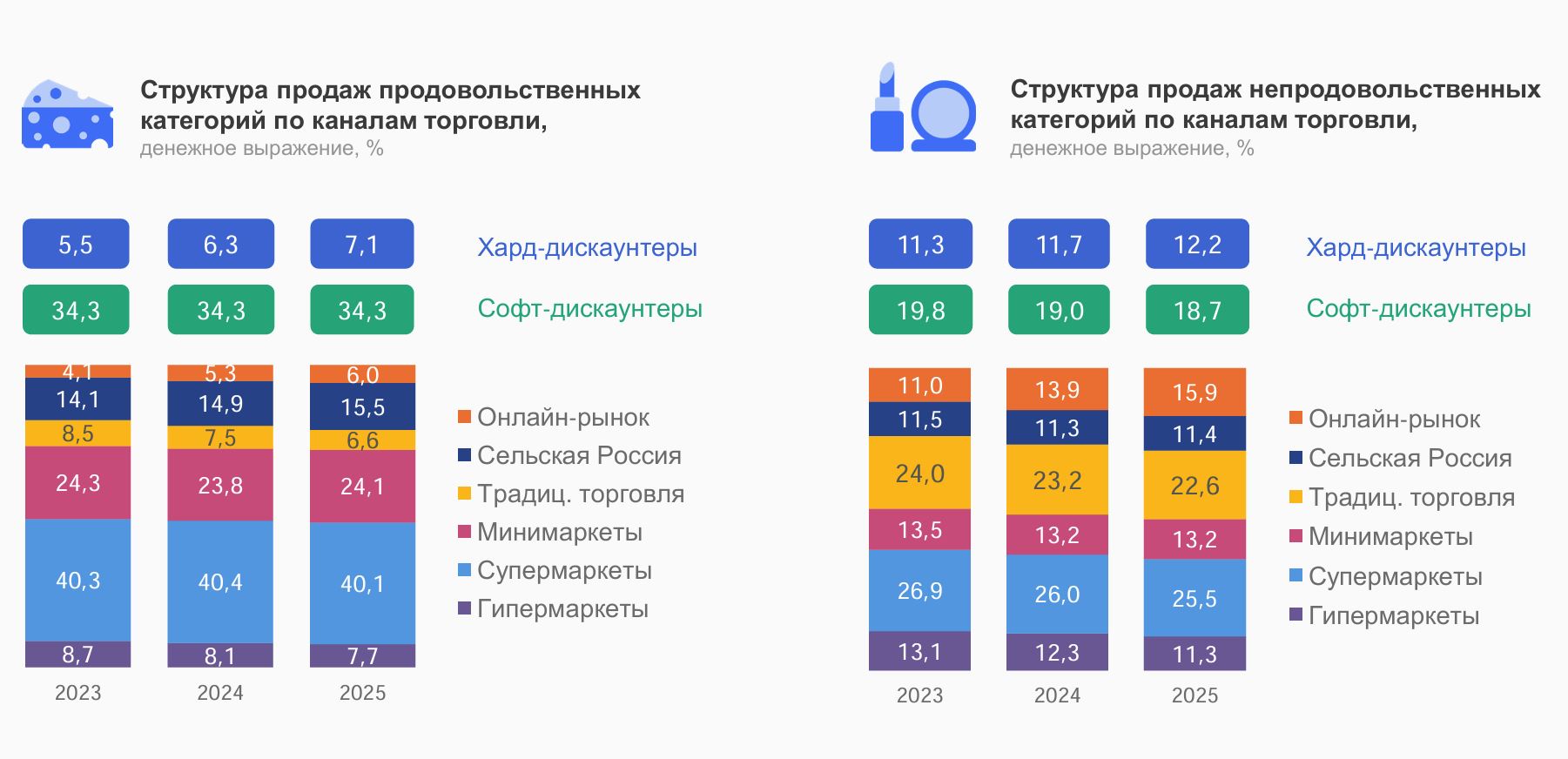 Номинальный рост рынка FMCG за 12 месяцев (по сентябрь 2025 г.) составил 12%. Динамика онлайн-продаж почти в три раза выше, чем у офлайн-рынка, хотя развитие маркетплейсов замедляется вслед за «взрослением» всего онлайн-рынка. При этом продажи частных марок (СТМ) также растут быстрее общего рынка — 17,2% год к году.