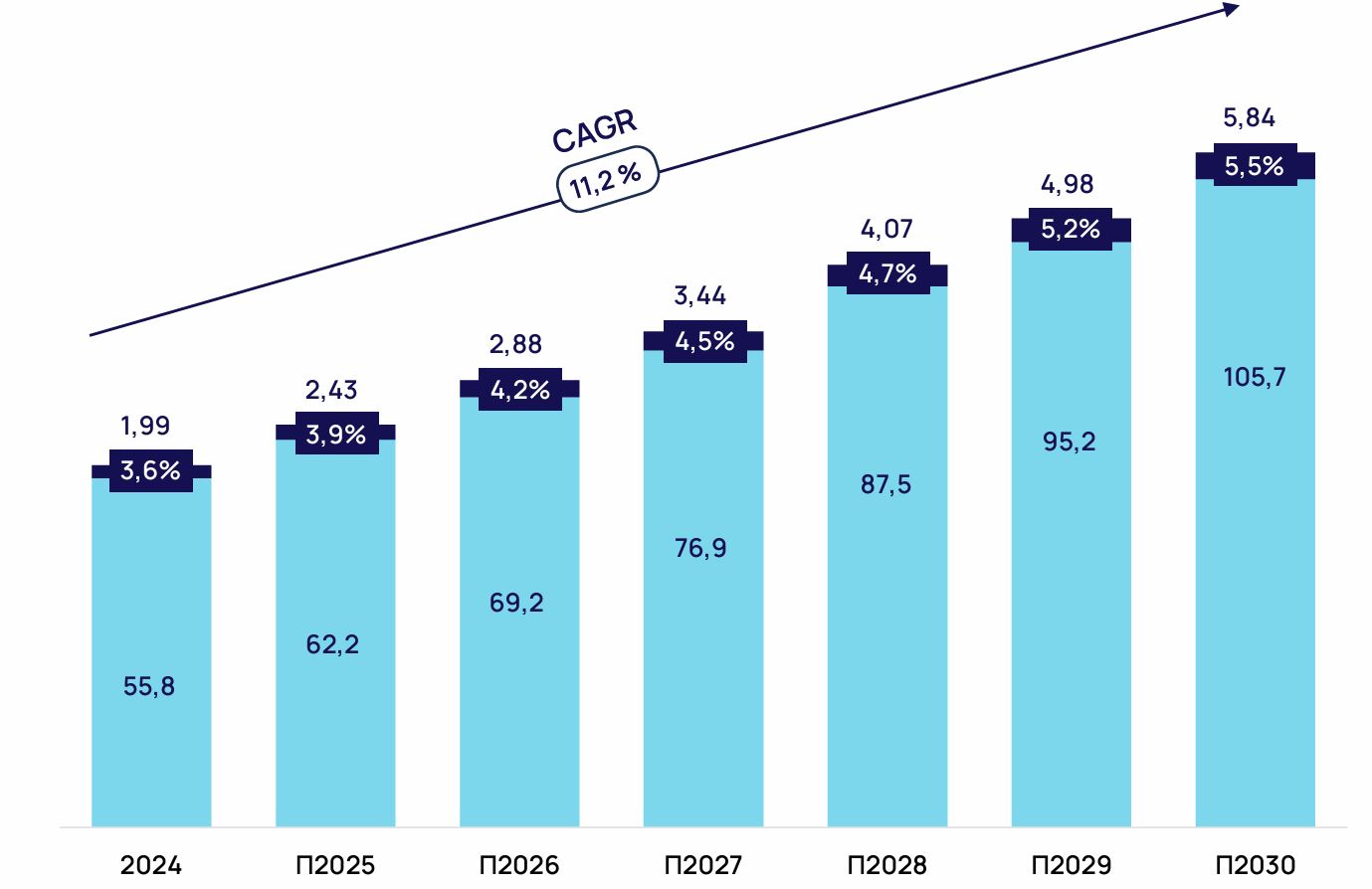 Аналитики прогнозируют, что к 2030 г. вклад ИИ в выручку российского ретейла увеличится в 1,5 раза, а доля рынка компаний, применяющих ИИ, вырастет с 50% до 80%.