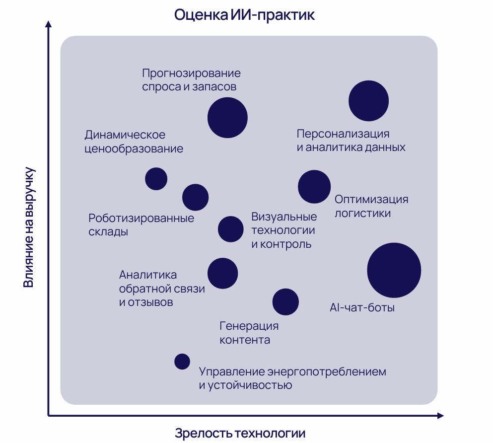 Внедрение ИИ-решений становится стандартом для крупнейших игроков рынка: 8 из 10 ведущих ретейлеров России применяют ИИ. Использование нейросетей способствует росту выручки и производительности, оптимизации расходов и увеличению лояльности клиентов.
