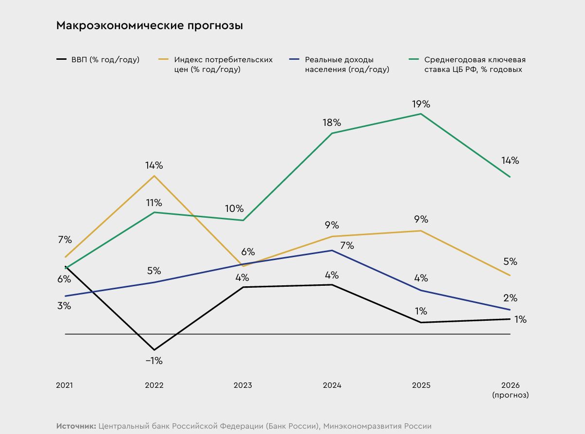 Макроэкономические прогнозы на 2025–2026 гг. указывают на замедление роста экономики. По данным Минэкономразвития и Банка России, рост ВВП составит около 1% в год, реальные доходы населения увеличатся на 3,8% в 2025 г. и на 2,1% в 2026 г. Опрошенные девелоперы ожидают снижения ключевой ставки до 15% в конце 2025 г. и до 13% в конце 2026 г. На этом фоне рынок жилья теряет импульс спроса.