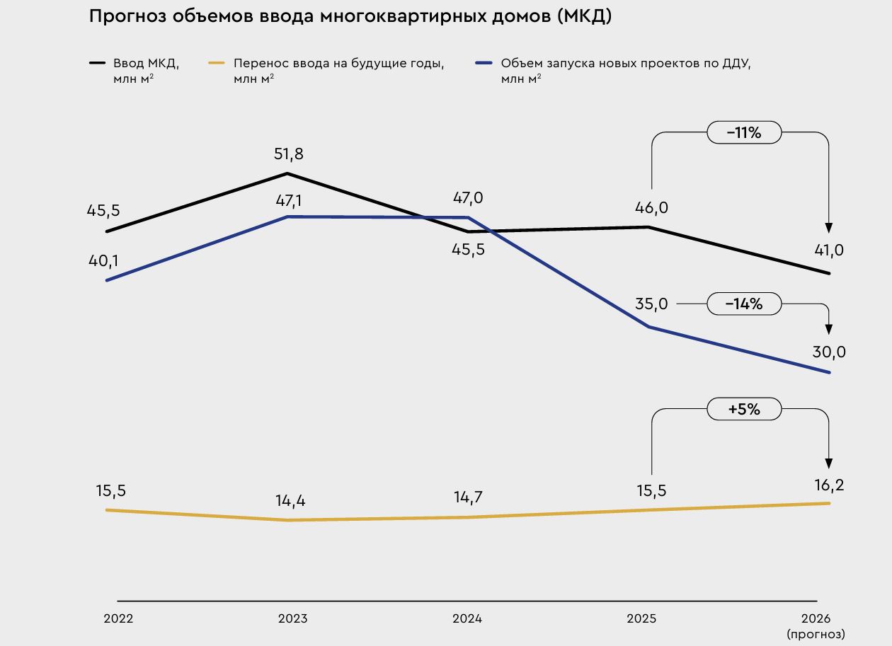 Операционные затраты также растут. По оценкам девелоперов, стоимость стройматериалов вырастет примерно на 7,5% в 2025 г. и на 5% в 2026 г., фонд оплаты труда — на 10% в 2025 г. и на ~3% в 2026 г. При этом опрошенные девелоперы в среднем ожидают рост своих собственных продаж на 30% и увеличение ввода на 15–20%.