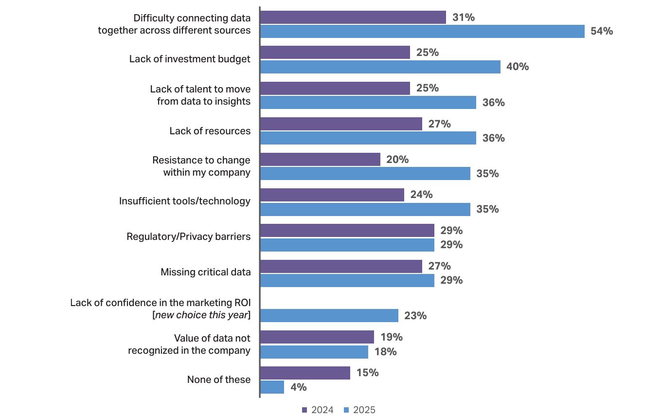 Больше половины CMO называют фрагментацию данных и сложность их интеграции из разных источников ключевым барьером для получения инсайтов. Это сдерживает развитие аналитики: лишь 9% респондентов работают с данными в реальном времени, а большинство (63%) получают инсайты позже, чем им хотелось бы.