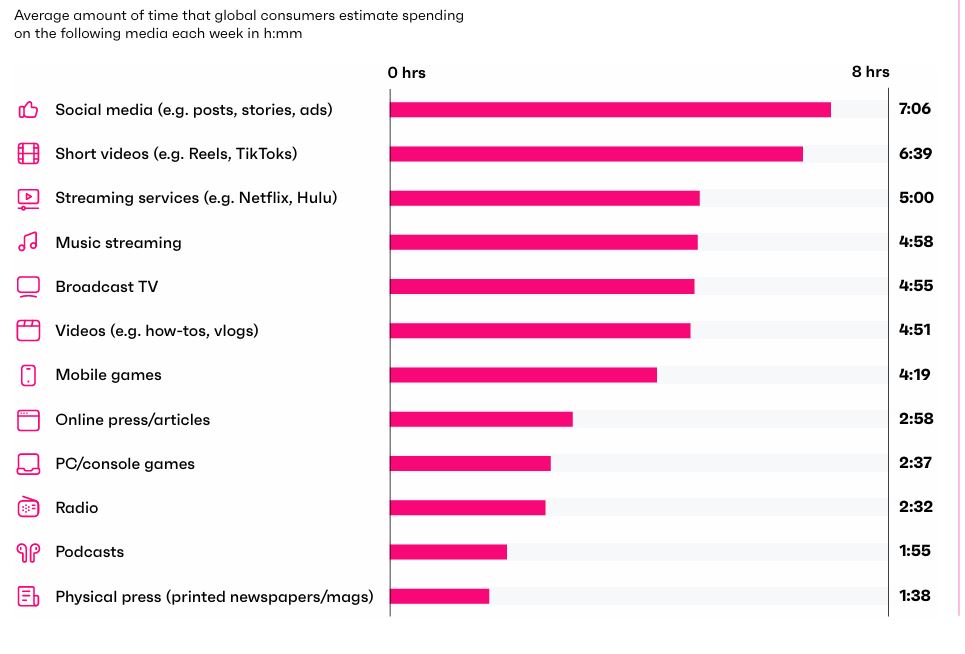 Потребители по всему миру тратят в среднем более 7 часов в неделю на классические соцсети и около 6,5 часа на короткие видео, что в сумме превышает время, проведенное за телевидением, стримингом и радио вместе взятыми. При этом меняются мотивы использования: если раньше главной причиной было общение, то теперь для поколения Z на первый план выходит просмотр любимых блогеров и «заполнение свободного времени». Бизнесу однозначно стоит включить соцсети в свой медиаплан на 2026 год.