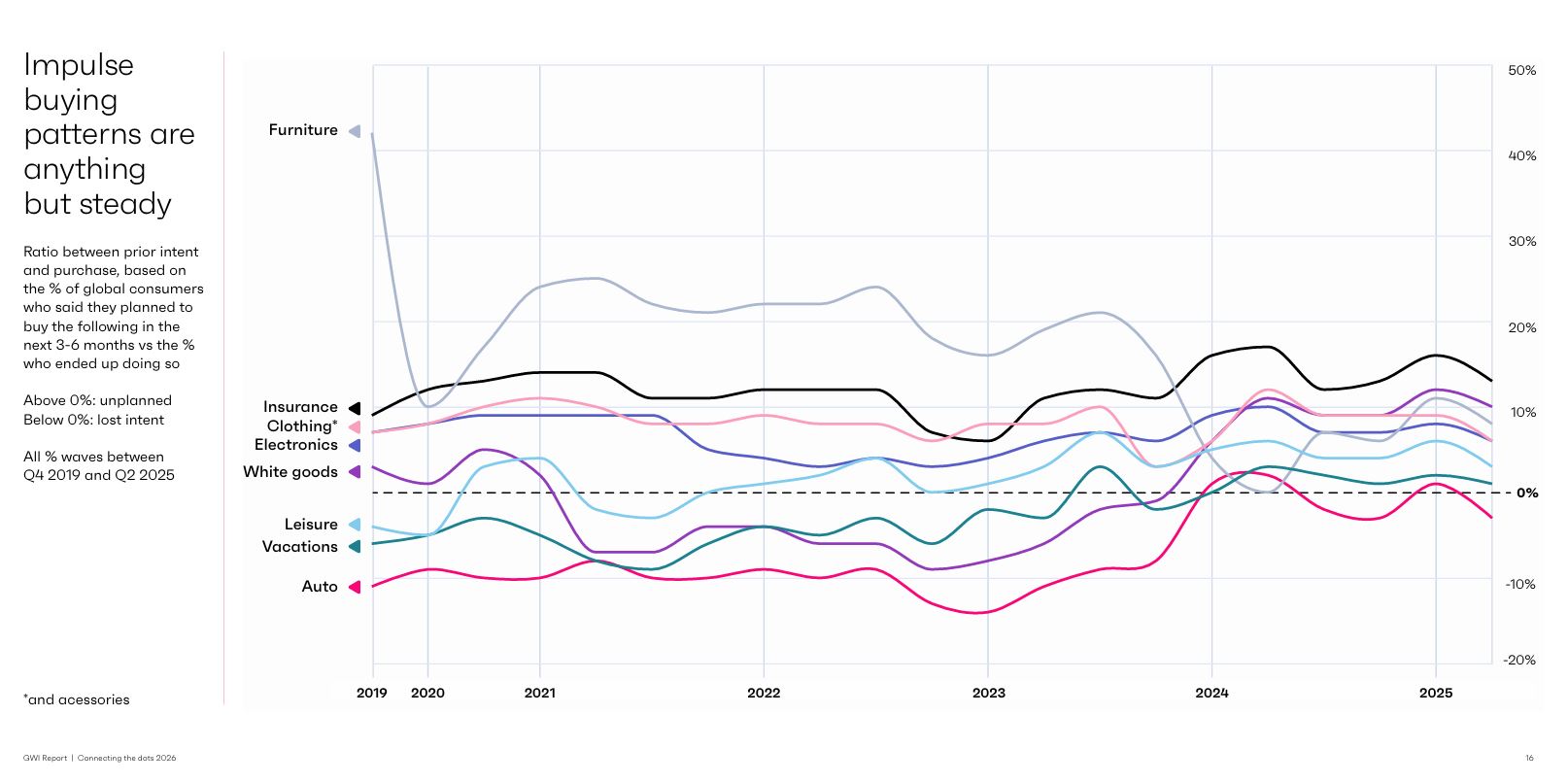 Традиционное разделение на запланированные и импульсные покупки размывается, особенно когда речь идет о комплексных категориях. Например, каждый пятый (20%) делает импульсные покупки в сфере технологий, а каждый десятый (10%) — в сфере путешествий. Это указывает на то, что так называемый «импульс» часто становится активацией скрытого, давно формировавшегося намерения. Это значит, что брендам стоит сфокусироваться на понимании своего покупателя и долгосрочном доверии, а не на сиюминутном таргетинге.