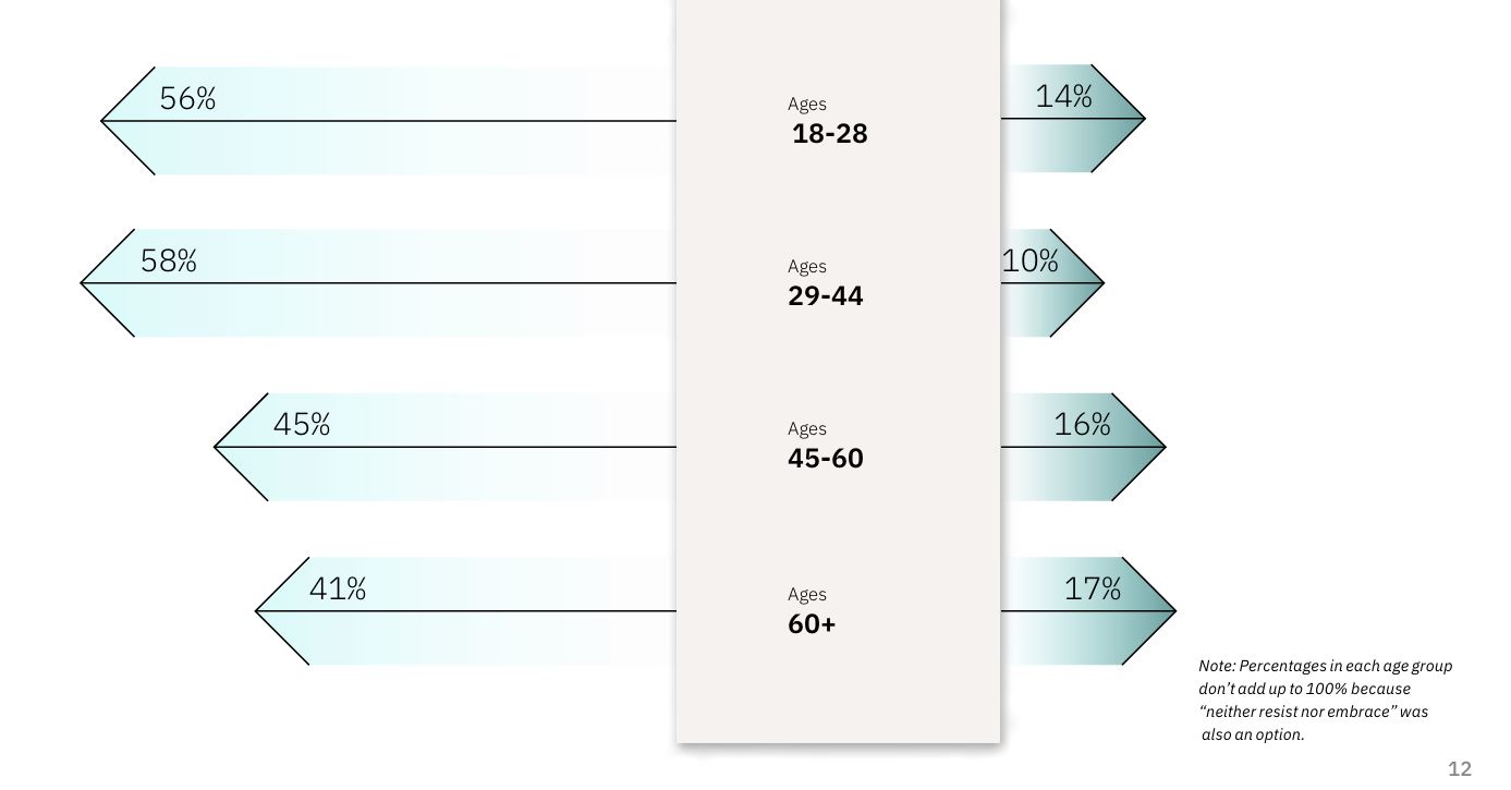 Отношение к ИИ среди сотрудников меняется. Все больше готовы адаптироваться к использованию нейросетей, а не сопротивляться им. Например, среди сотрудников 18–28 лет 56% готовы принять ИИ, а 14% противятся этому. При этом 61% работников ожидают, что их роль значительно изменится из-за новых технологий уже в 2026 г. Еще 47% считают, что к 2030 г. ИИ сделает их работу просто ненужной.