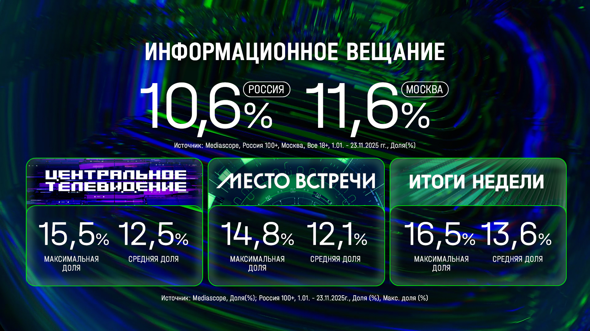 Информационное вещание — визитная карточка НТВ. В 2025 году доля всех информационных программ НТВ составила 10,6% в 18+. Доля московских зрителей — 11,6%. В топ-3 итоговых информационно-аналитических программ вошли «Итоги недели» с Владимиром Чернышевым с рейтингом 5,1% (доля 16,5%) и «Центральное телевидение» с Вадимом Такменевым с рейтингом 4,2% (доля 14,2%).