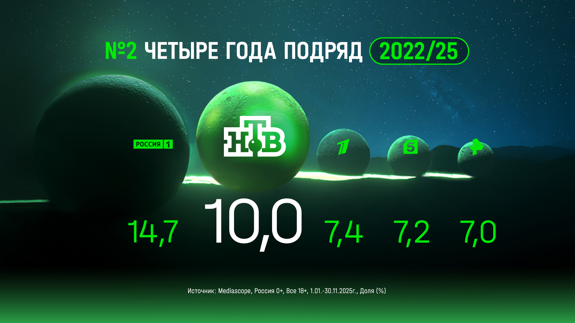 Январь и февраль 2025 года прошли с рекордными показателями. Январь с долей 11,0% стал лучшим январем для НТВ за всю историю измерений аудитории всей России старше 18 лет, а также лучшим за последние 9 лет среди зрителей старше 18 лет, проживающих в крупных городах. Доля НТВ в феврале в 18+ стала рекордной среднемесячной долей канала за всю историю измерений по России 0+: она составила 12,0%. В прайме будних дней НТВ занял первое место.