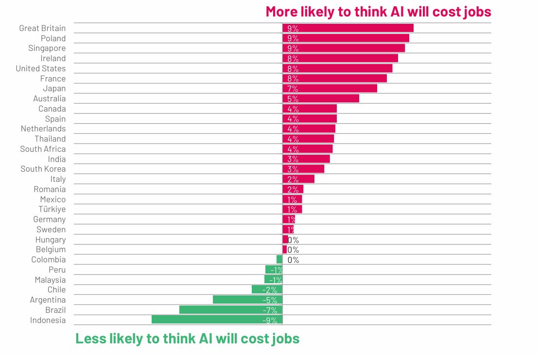 В сфере искусственного интеллекта доминируют опасения по поводу занятости. В среднем 67% респондентов считают, что ИИ приведет к потере многих новых рабочих мест в их стране. Наибольший уровень опасений зафиксирован в Индонезии и Сингапуре (по 76%), наименьший — в Японии (46%). При этом лишь 43% верят, что ИИ создаст много новых рабочих мест. За год тревога относительно потери рабочих мест из-за ИИ выросла в 21 из 30 исследуемых стран.