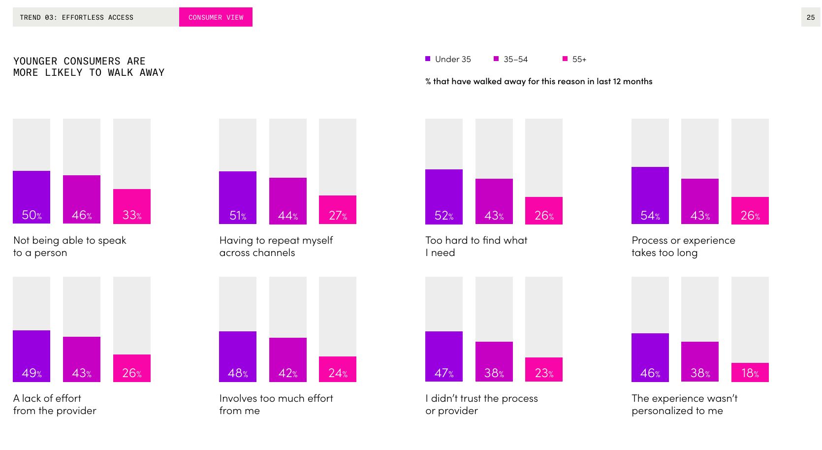 Больше половины опрошенных потребителей (58%) считают, что взаимодействие с брендами все еще требует слишком много усилий, и 40% из-за этого уходили от компании. Особенно нетерпелива молодежь. Бренды понимают, что бесшовные услуги — основа лояльности, но боятся, что в погоне за скоростью и простотой потеряют качество. Основная задача для большинства (43%) — балансировать между мгновенным результатом и персонализацией.