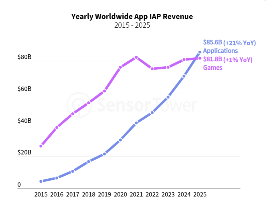 Одним из самых заметных сдвигов 2025 года стало то, что неигровые приложения впервые превысили игры по доходам от покупок внутри приложений (IAP). По оценкам Sensor Tower, пользователи потратили на неигровые приложения около $85 млрд, что на 21% больше, чем годом ранее, и почти в три раза больше, чем пять лет назад.