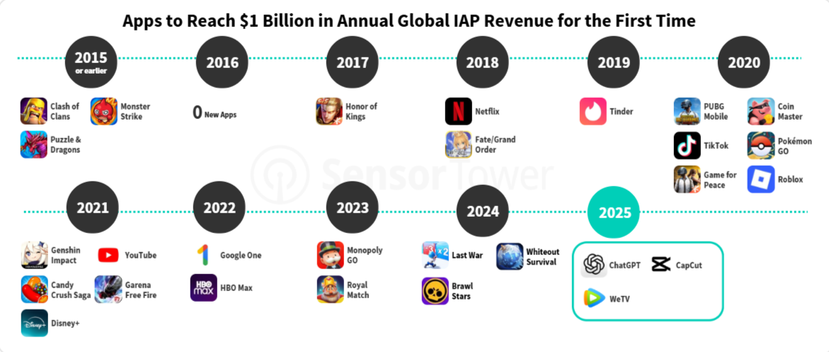 «В 2025 году три приложения впервые превысили отметку в $1 млрд по глобальному доходу от IAP. ChatGPT преодолел этот порог, заработав $3,4 млрд, и стал третьим самым кассовым приложением года после TikTok и Google One. Его рост является историческим — ни одно приложение еще не достигало годового дохода IAP в $3 млрд так быстро», — заявили в Sensor Tower.