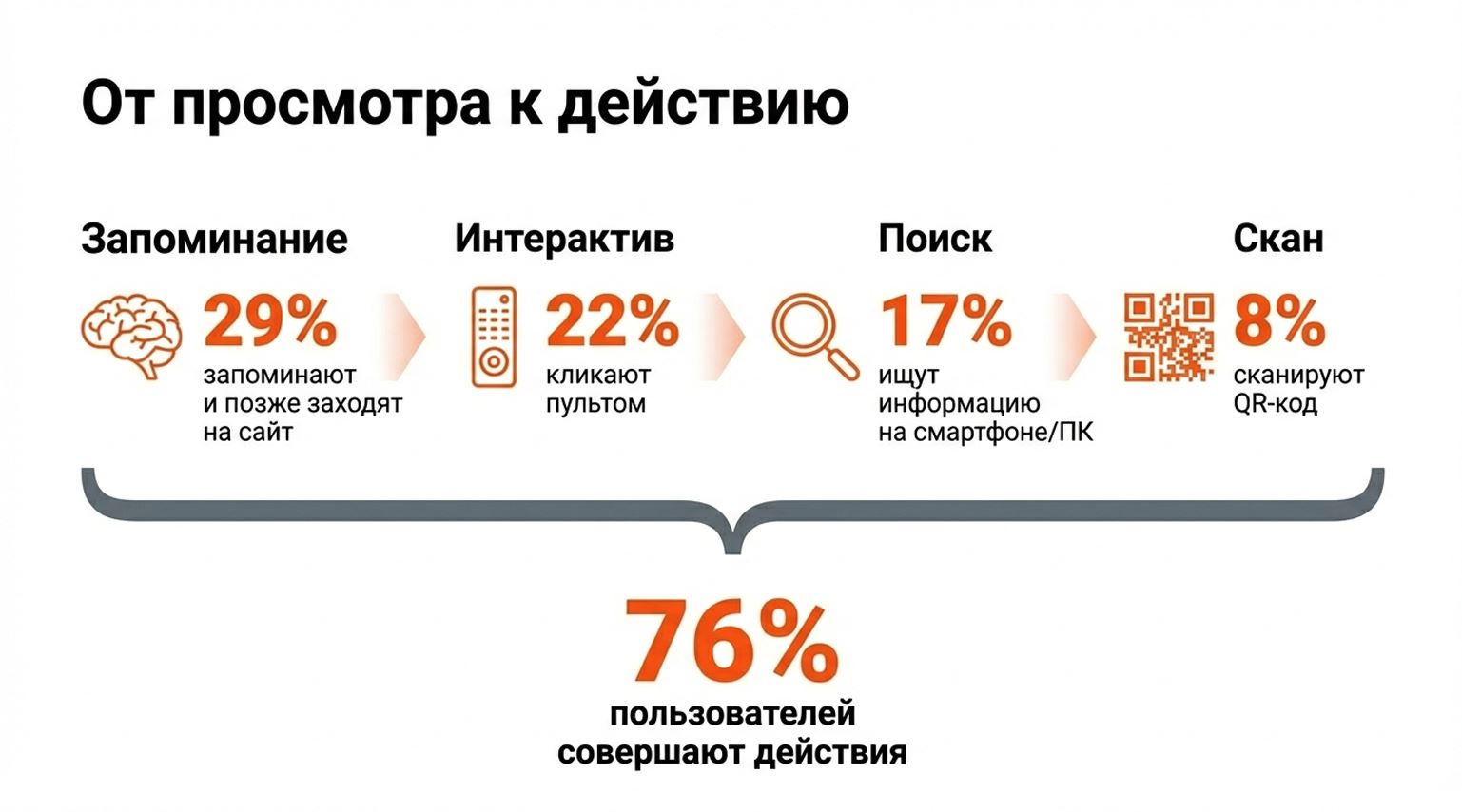 Рекламу на стартовом экране Smart TV замечают 56% опрошенных пользователей сразу после включения устройства. При этом она показывает высокий Conversion Rate: 76% пользователей после ее просмотра совершают целевые действия, такие как клик, поиск на другом устройстве или последующий переход на сайт. Почти треть респондентов считает такую рекламу более заметной, чем внутри приложений или ТВ-каналов.