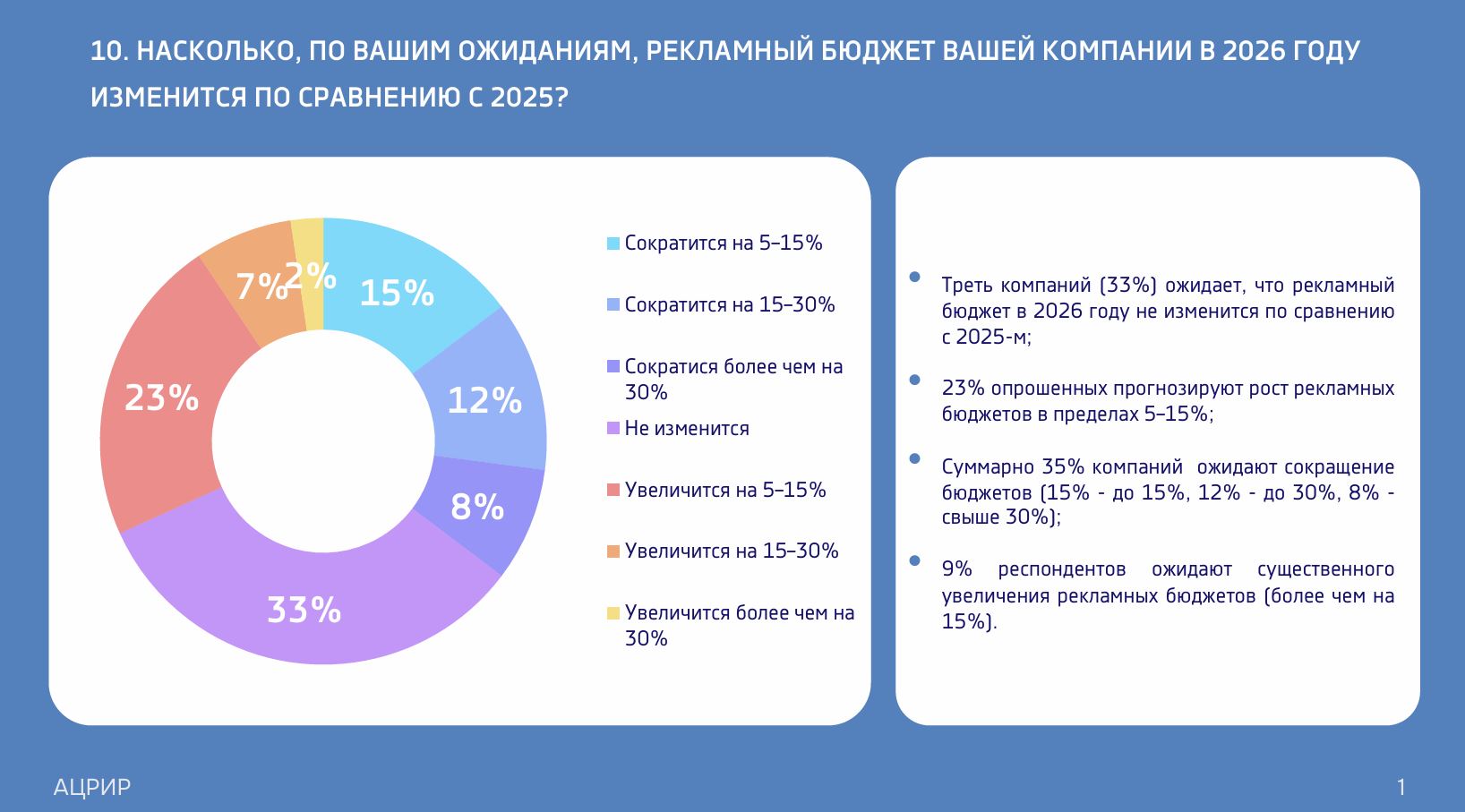 Треть компаний (33%) ожидает, что рекламный бюджет в 2026 году не изменится по сравнению с 2025-м. Однако 35% опрошенных прогнозируют сокращение расходов на 5–30%.