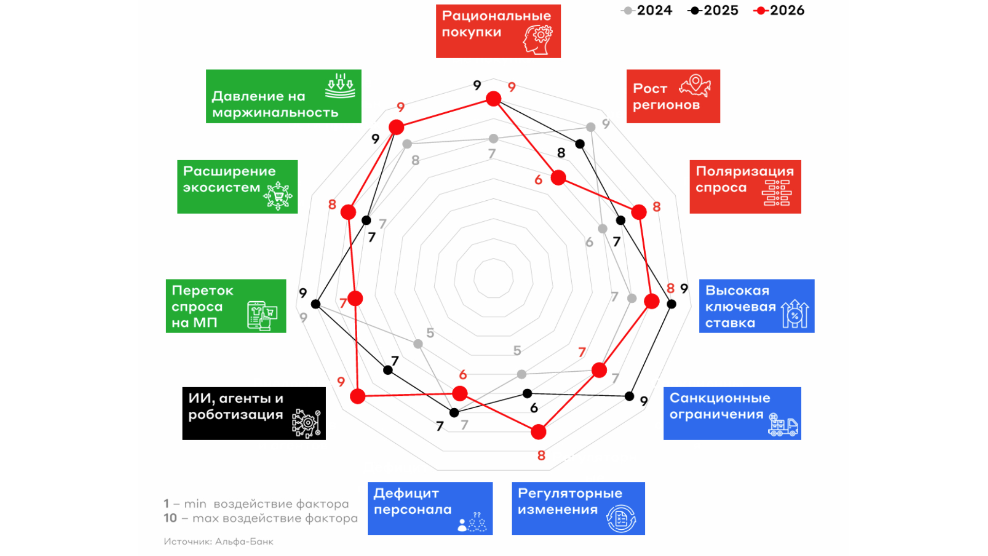 изменение потребительского поведения (рост рациональности, сокращение горизонта планирования, поляризация спроса между премиум- и бюджетным сегментами);