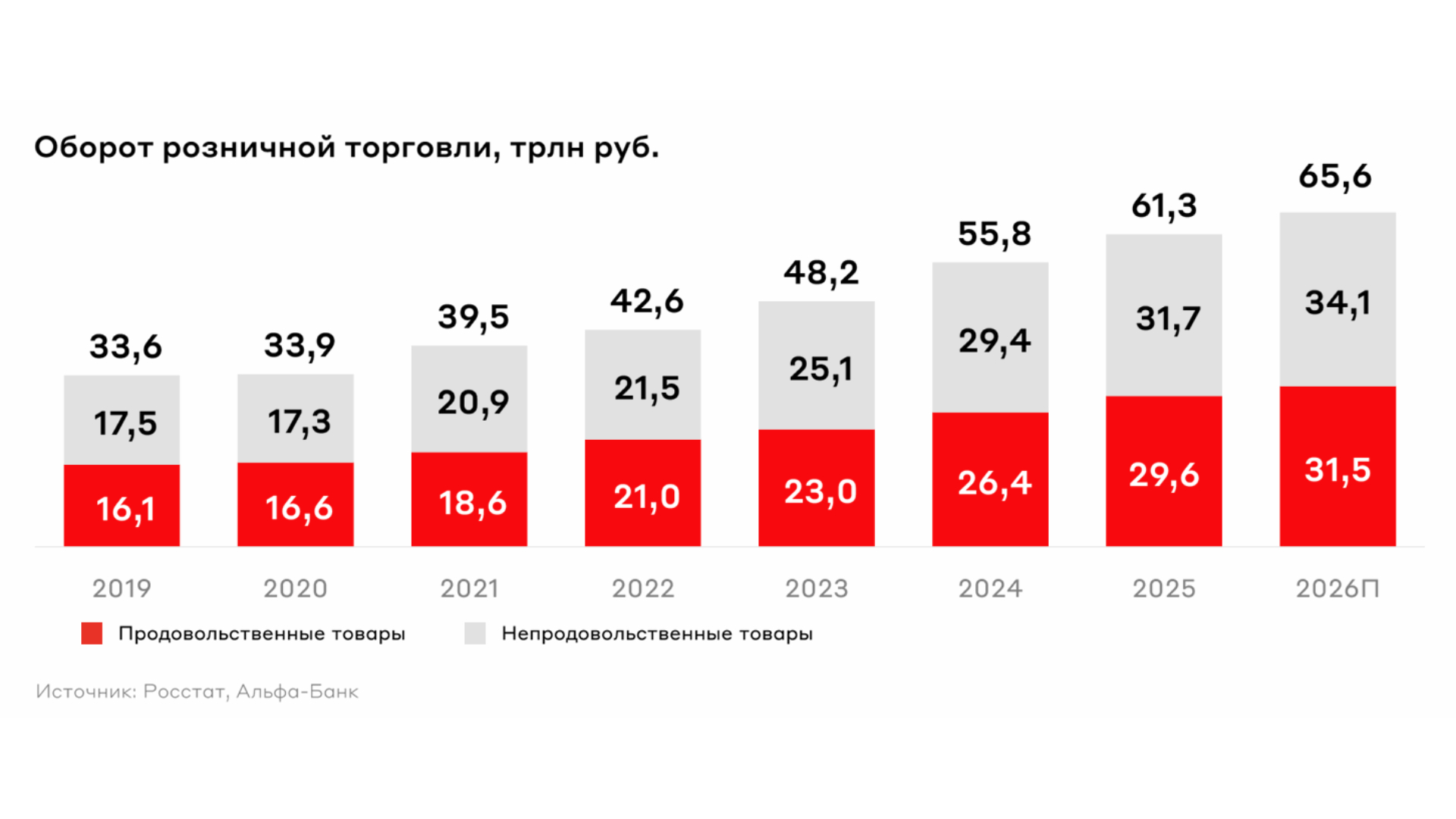 Общий прогноз: замедление потребительского спроса. В 2026 г. динамика розничной торговли продолжит замедляться на фоне снижения инфляции и темпов роста реальных доходов. Оборот рынка достигнет 65,6 трлн руб. Ожидается рост продовольственного сегмента на 6,6% (после 12,1% в 2025 г.), непродовольственного — на 7,4% (после 8% в 2025 г.). E-com останется ключевым драйвером с ростом 21% год к году, хотя его динамика также замедлится.