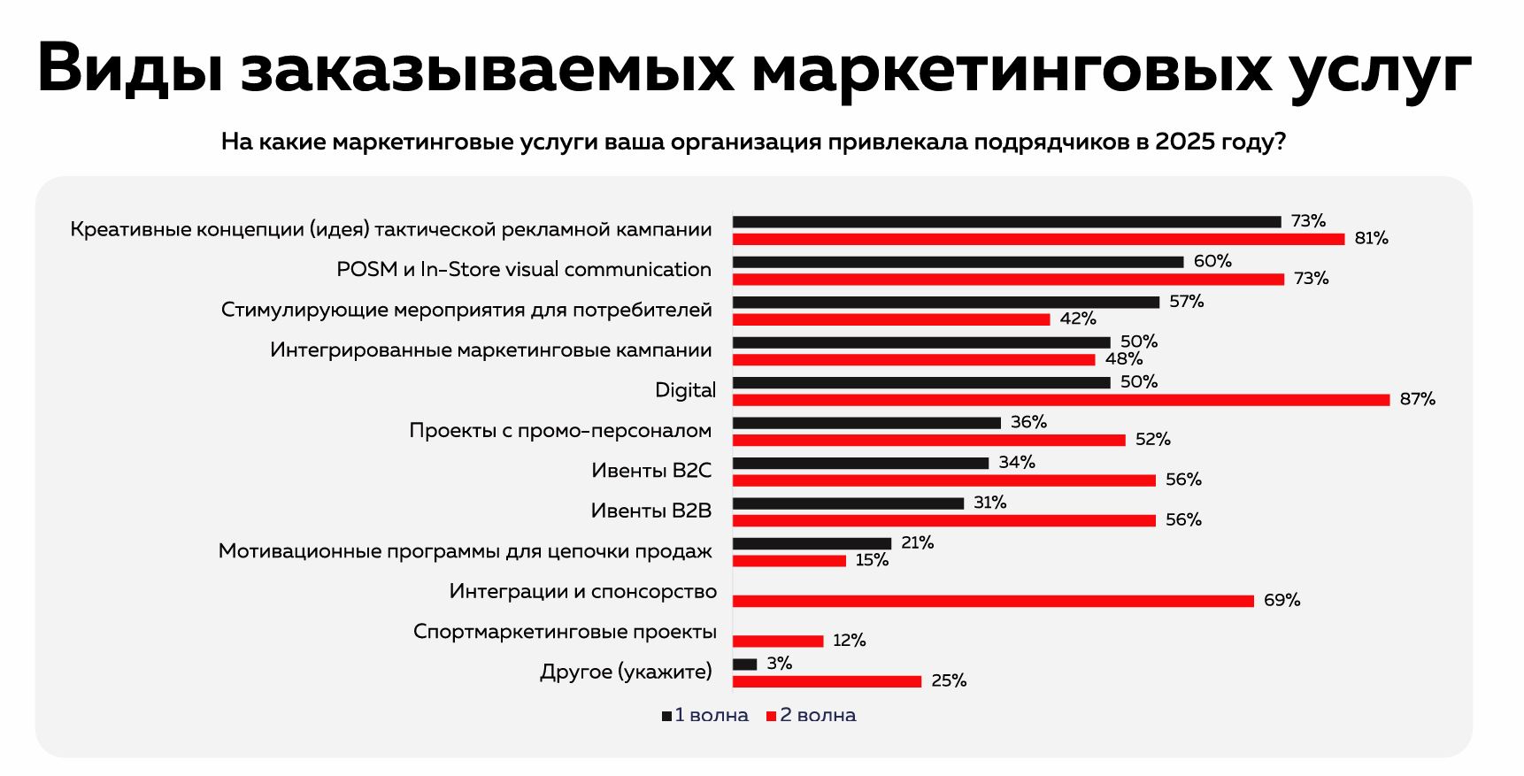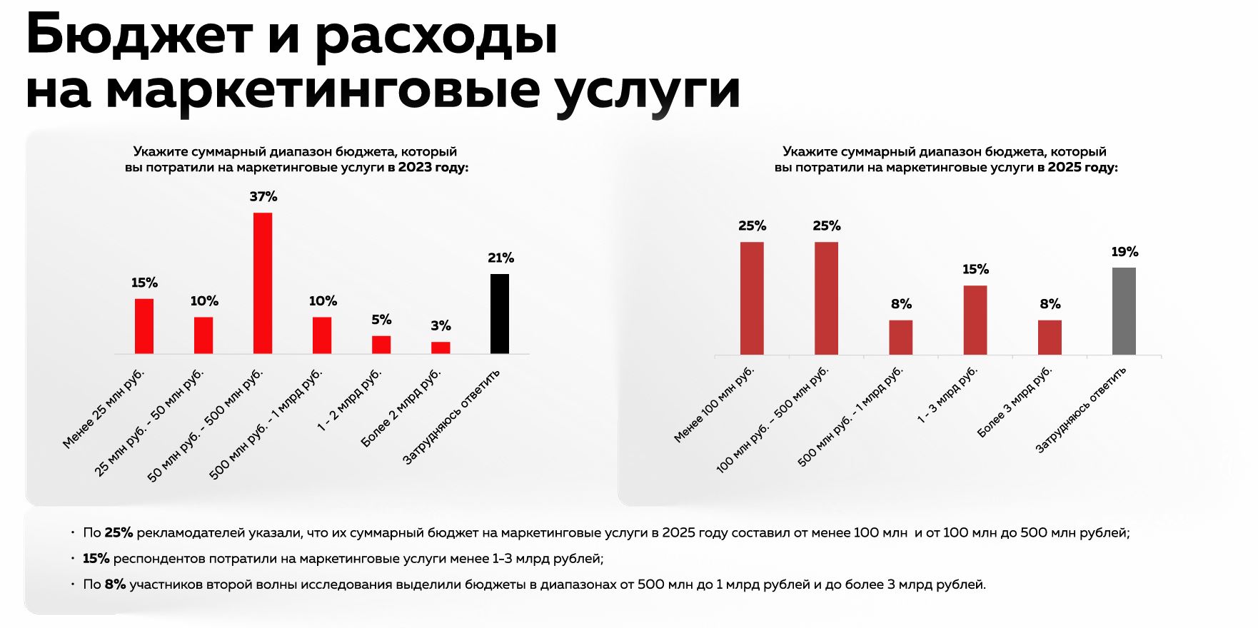 Большинство рекламодателей (83%) считают, что их маркетинговые задачи требуют уникальных креативных решений. При этом резко вырос спрос на комплексные проекты — 87% респондентов привлекали подрядчиков для оказания диджитал-услуг, а 69% — для спонсорства и интеграций. В то же время половина рекламодателей потратили до 500 млн руб. на маркетинг в 2025 г.