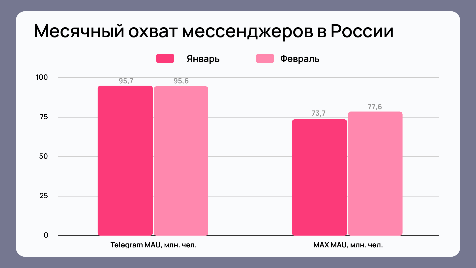В «Телеграме» заметен незначительный отток пользователей по отношению к январю 2026 года: −0,3%. При этом MAU Max вырос на 5,2% (Monthly Active Users — количество уникальных юзеров, посещавших интернет-ресурс минимум один раз за последний месяц).