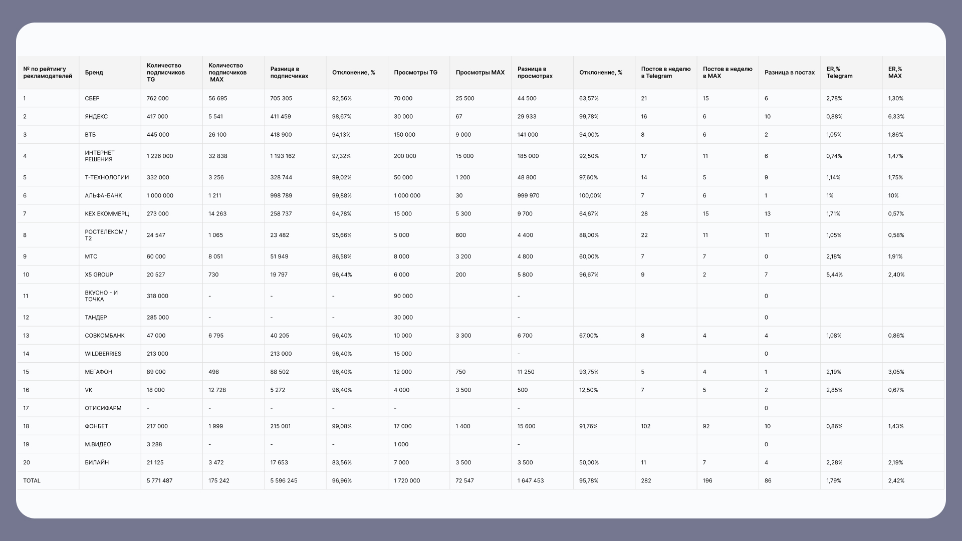 Анализ присутствия крупнейших рекламодателей показывает высокую степень проникновения брендов в новую социальную сеть. На текущий момент 75% компаний из топ-20 уже создали свои каналы в Max. Примечательно, что только 25% рекламодателей пока не продублировали свои аккаунты, что позволяет говорить о сформировавшемся тренде на мультиканальность.