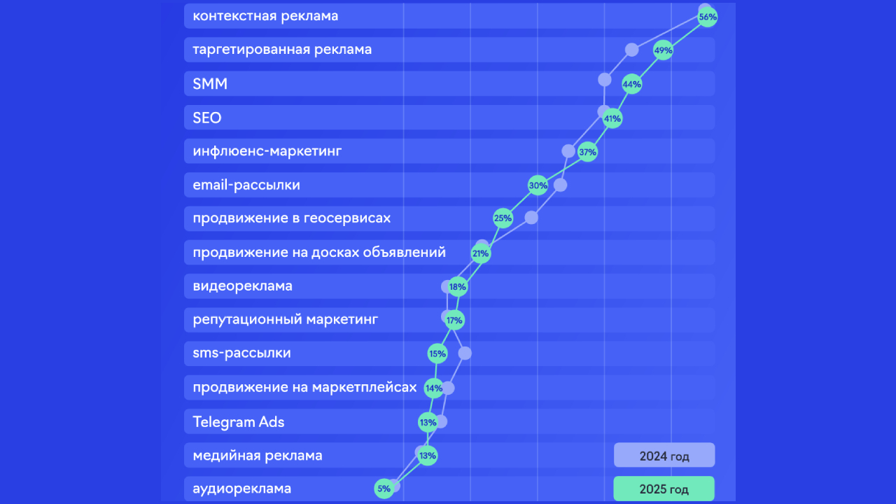 В 2025 г. хотя бы один новый канал продвижения впервые запустили треть компаний, а в 2026 г. тестировать новые инструменты планируют уже 78% рекламодателей. Среди наиболее приоритетных направлений: