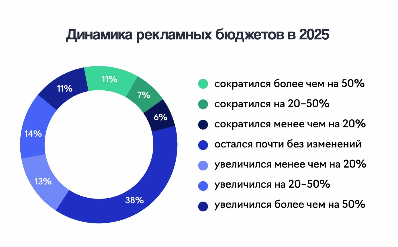 Бюджетная политика становится более осторожной: доля бизнеса, оставляющего рекламный бюджет без изменений, выросла с 24 до 41%. При этом 39% компаний ожидают увеличения расходов, и лишь 20% прогнозируют их сокращение. Половина респондентов тратит на рекламу до 50 тыс. руб. ежемесячно.
