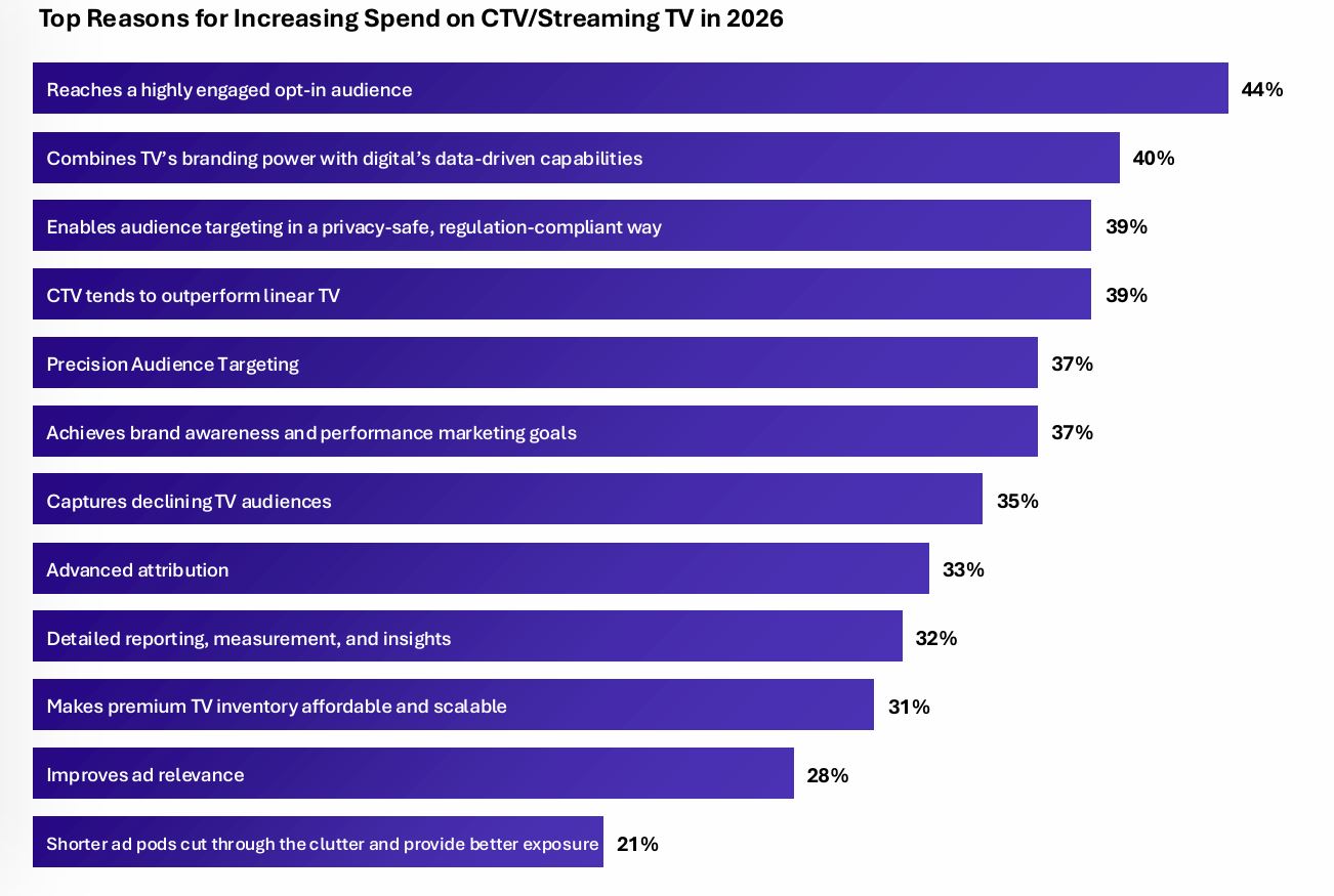 Согласно отчету, 70% опрошенных рекламодателей планируют увеличить расходы на Connected TV (CTV) в среднем на 17% в 2026 г. Основные драйверы такого роста, по словам респондентов, — высокий уровень вовлеченности аудитории (44%) и сочетание охвата линейного ТВ с цифровой точностью (40%).