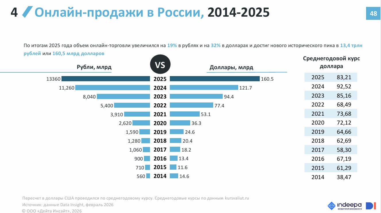 Объем российского рынка интернет-торговли в сегменте B2C достиг 13,4 трлн руб., что на 19% выше показателя предыдущего года. Количество заказов выросло на 24%, составив 8,3 млрд, при этом средний чек сократился на 5%, или до 1,6 тыс. руб., — снижение ускорилось на фоне укрепления рубля и замедления инфляции. Доля электронной коммерции в общем обороте розничной торговли достигла 25,6%, а в непродовольственном сегменте впервые превысила 50%.