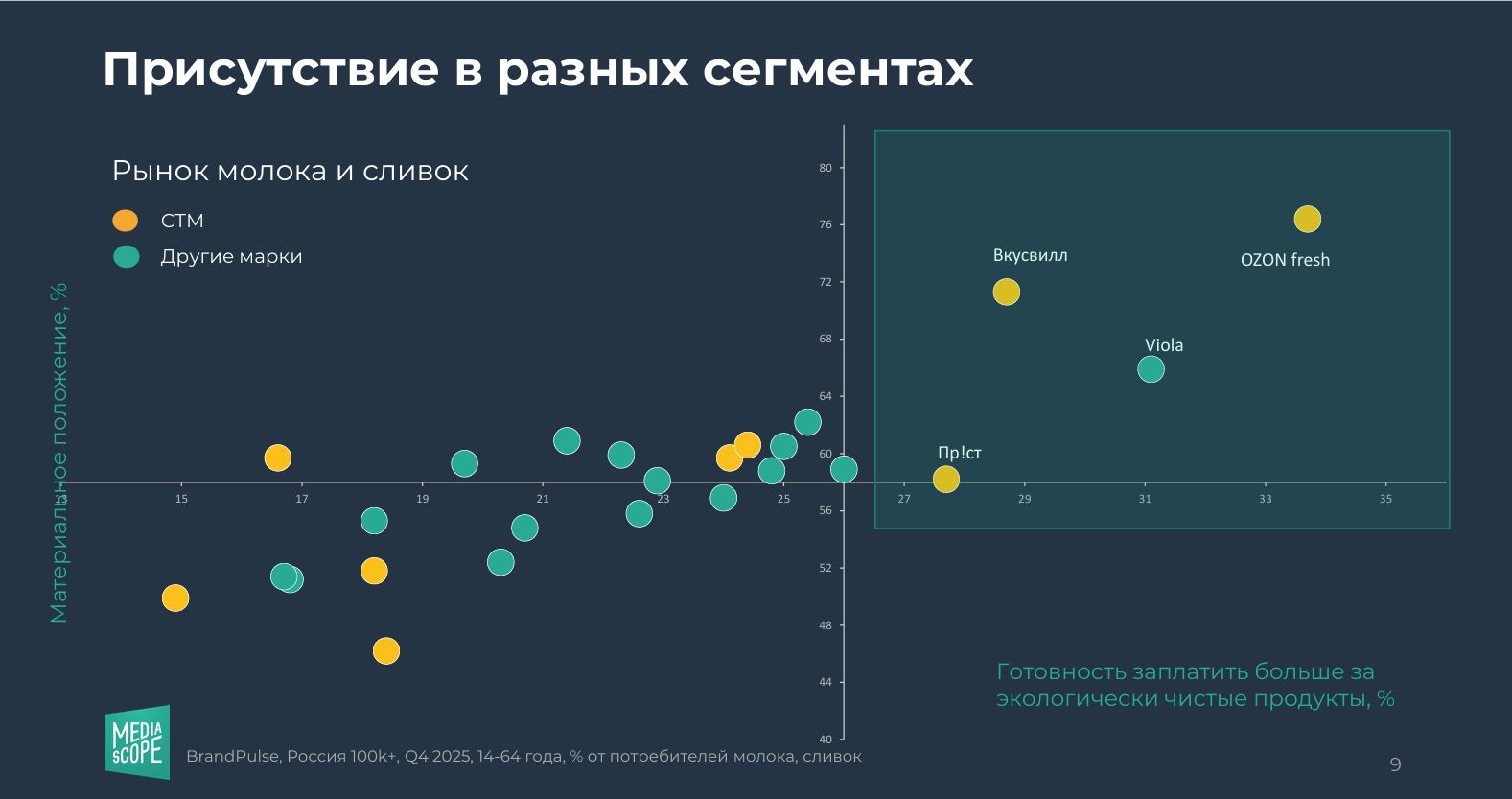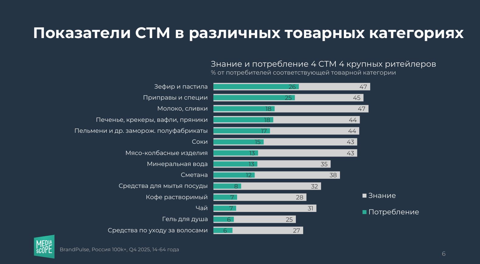 При этом частные марки не являются лидерами рынка в целом, но занимают сопоставимые позиции с другими игроками. Например, на рынке молока и сливок большинство СТМ находятся примерно на одном уровне с другими брендами по показателям знания и потребления, а некоторые демонстрируют показатели, сопоставимые с топ-игроками или даже занимают лидирующие позиции.