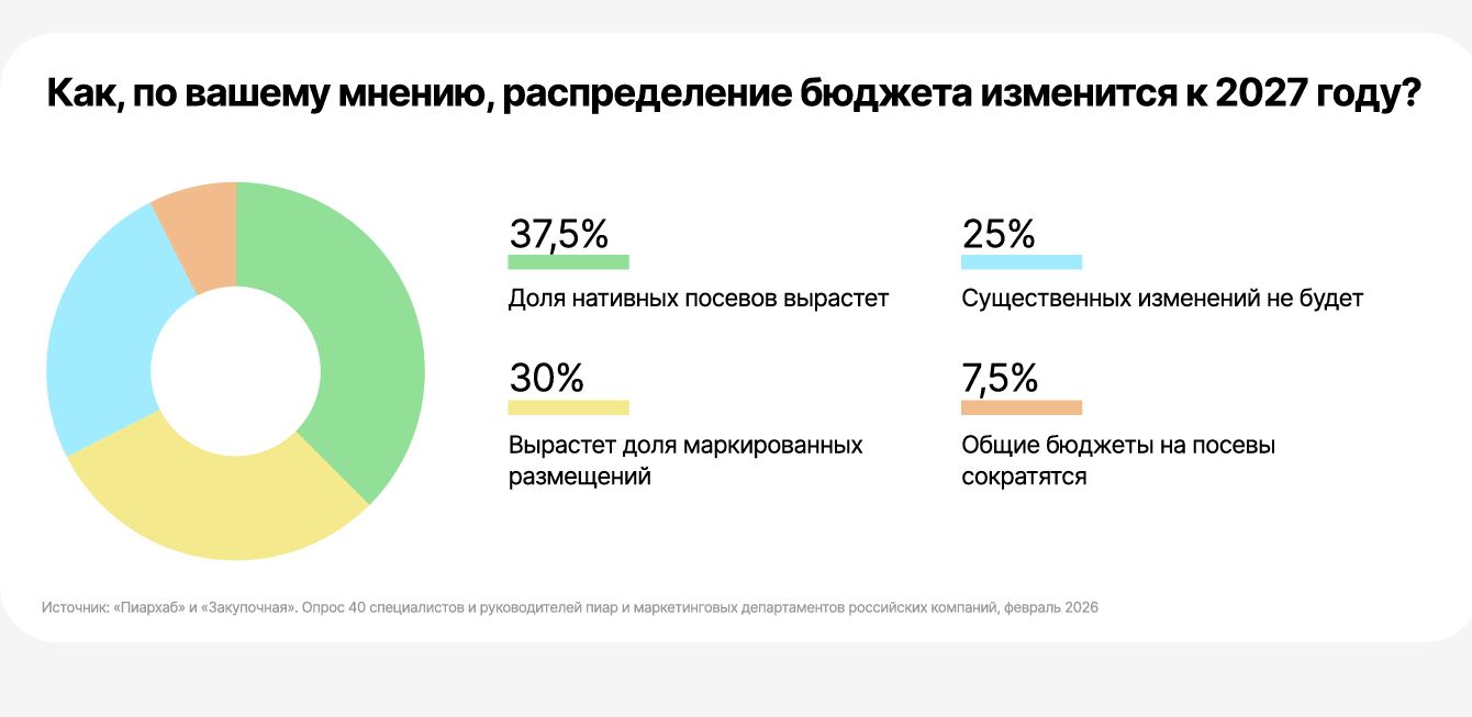 Нативная реклама в 2026 г. остается основным форматом продвижения: 52% компаний встраивают нативные посевы в стратегию и выделяют на них бюджет, 15% отдают нативу более половины digital-бюджета, а полностью отказываются от таких форматов лишь 2,5% опрошенных.