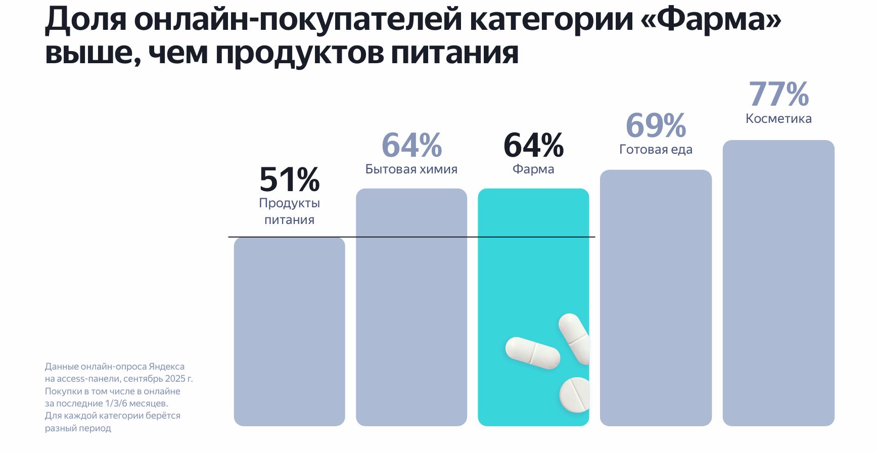 Онлайн-канал уверенно опережает общую динамику фармрынка. Объем поисковых запросов в категории «Фарма» достиг 380 млн, показав рост 13% год к году. При этом 36% респондентов покупали витамины и БАДы исключительно в интернете. В случае с лекарствами показатель составляет 20%. Доля онлайн-покупателей лекарств достигла 64% — уже выше, чем в категории продуктов питания.